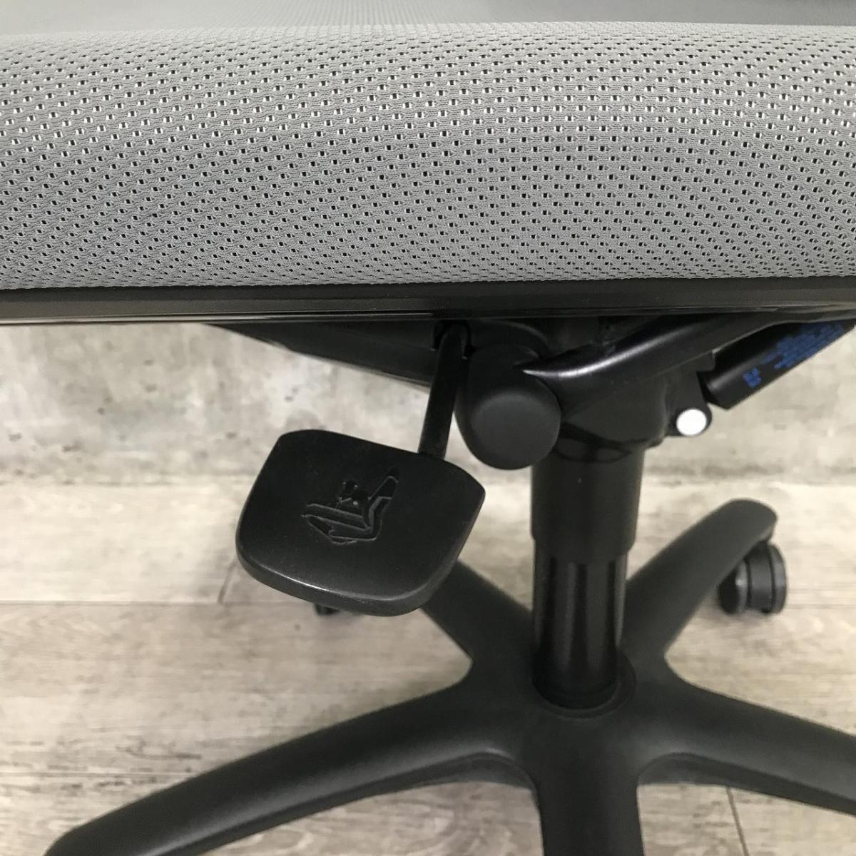 もう一つは、オカムラ社独自の""異硬度クッション""が座面に採用されていることです。これは座面が位置により異なる硬さのウレタンでできており、前方は腿裏を圧迫しないようソフトに、後方はしっかりと体重を支えるために少し硬めに作られています。クッション性とホールド感の両立により、長時間の作業での疲れを軽減してくれます。"