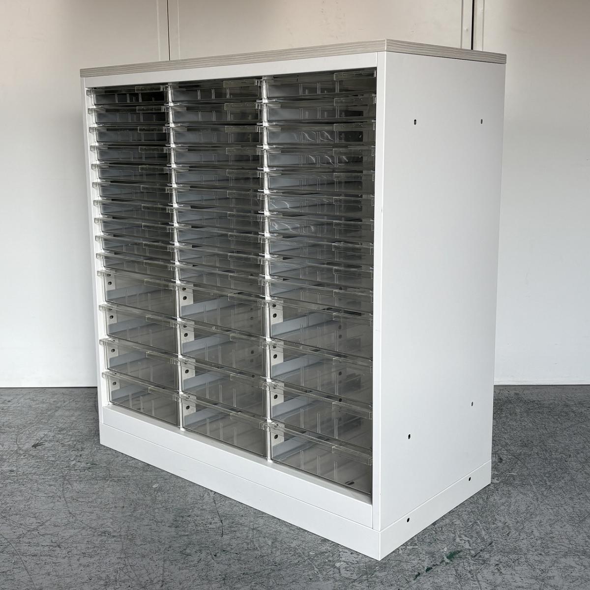 【書類・備品整理の必需品!】【珍しいクリトレが入荷!3列×浅型11段+深型5段】■イトーキ(ITOKI)製 シンラインシリーズ クリスタルトレー ローキャビネット ■3列×浅型11段+深型5段 ■天板・ベース付 ■色:ホワイト
