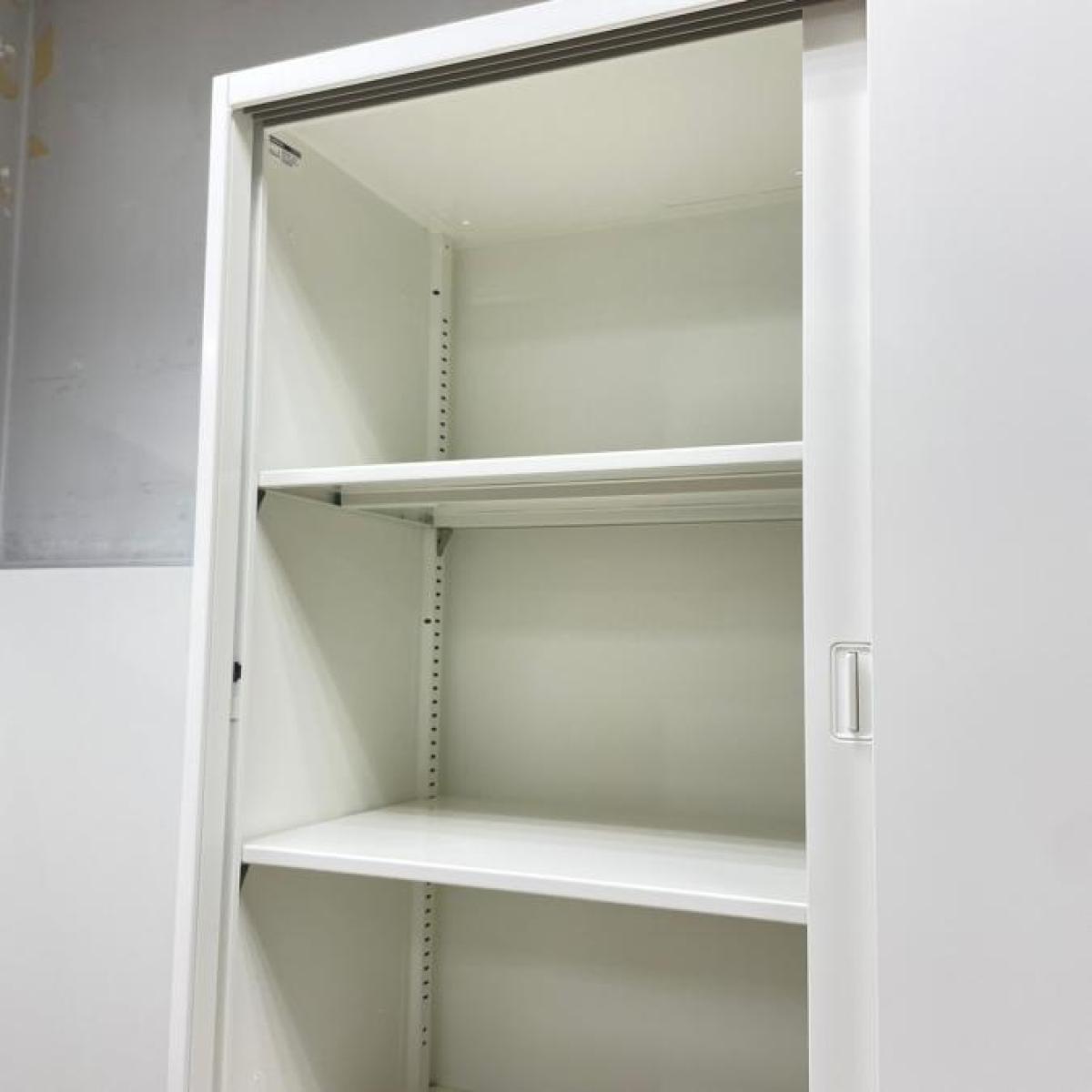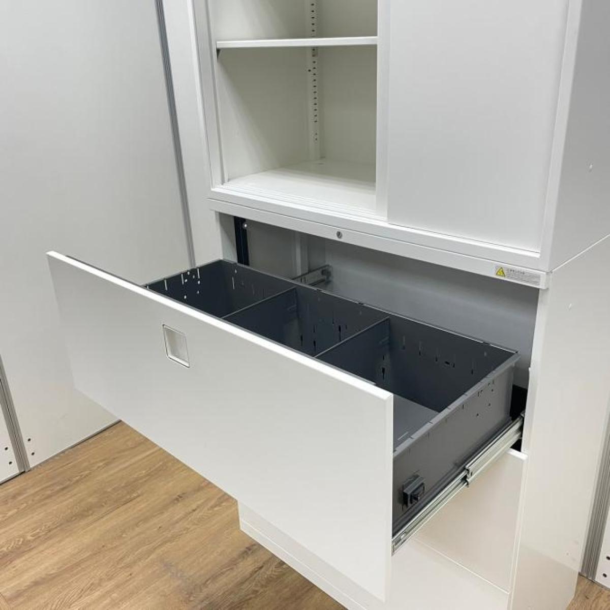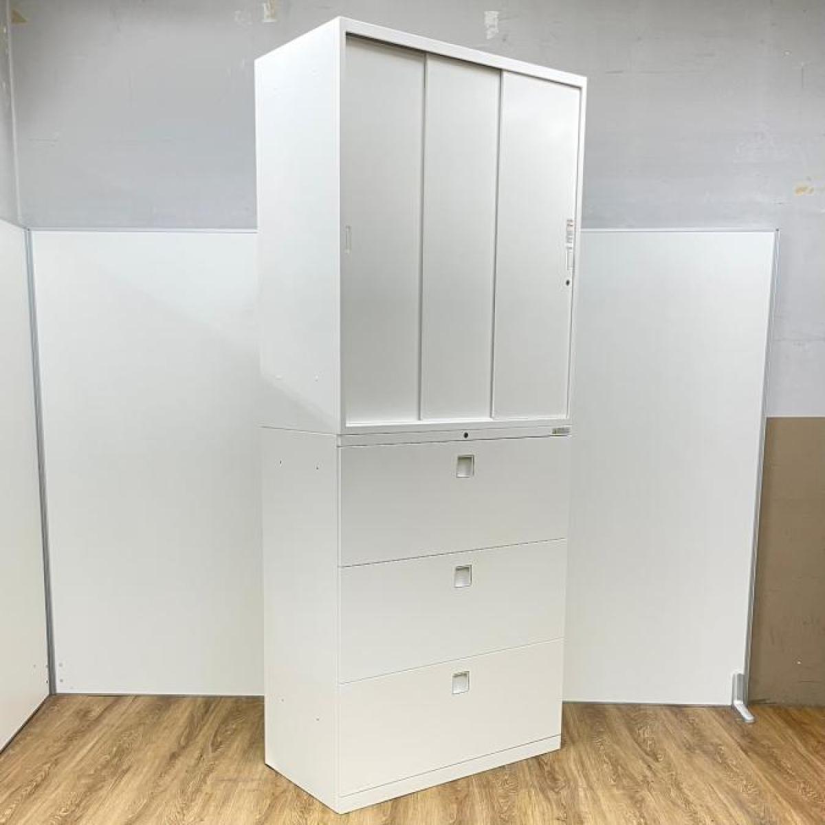 スライド式の扉+引き出しタイプの便利な書庫セットが入荷!使い勝手抜群のハイキャビネットが入荷! ■オカムラ/レクトライン/ホワイト 2枚引き戸+3段ラテラルキャビネット