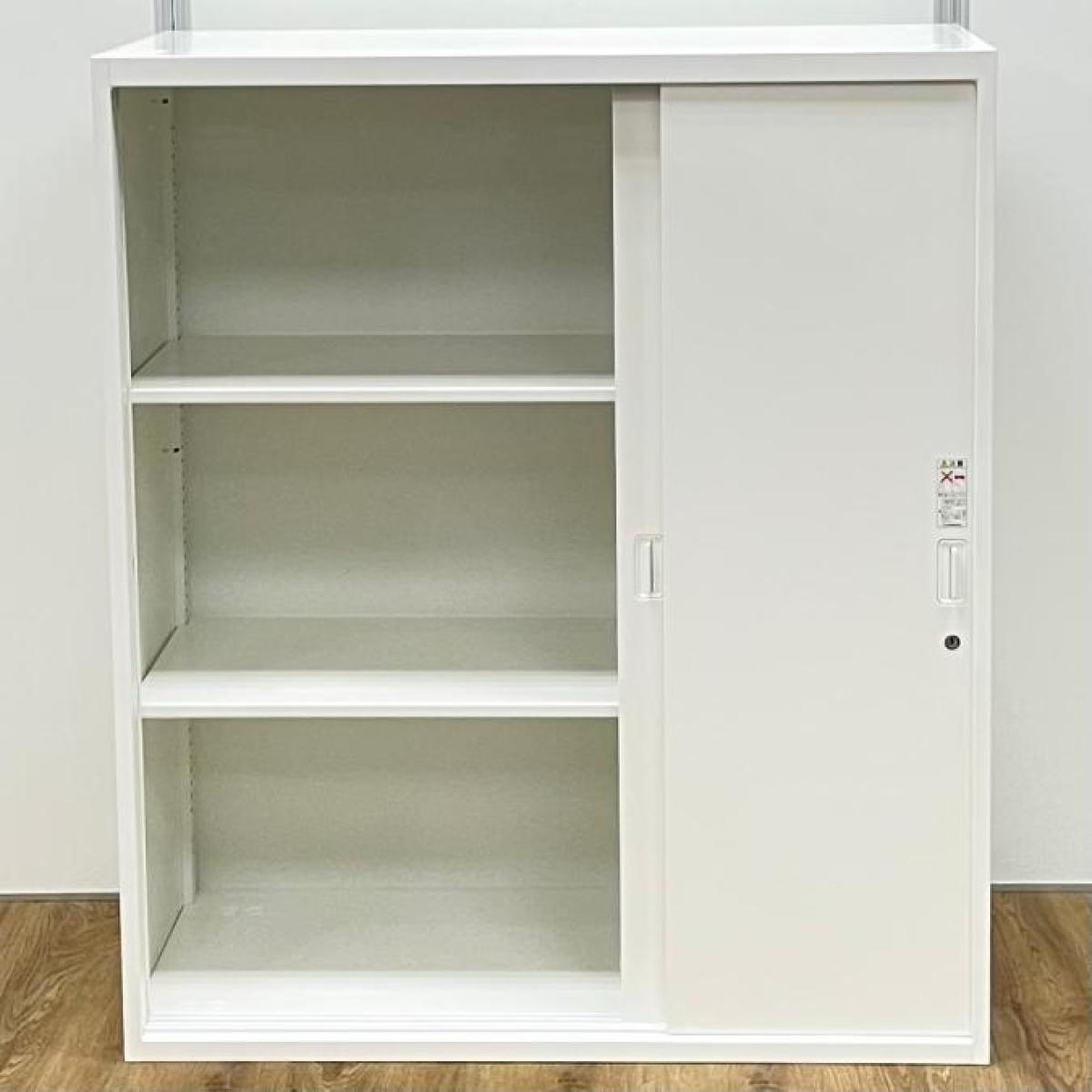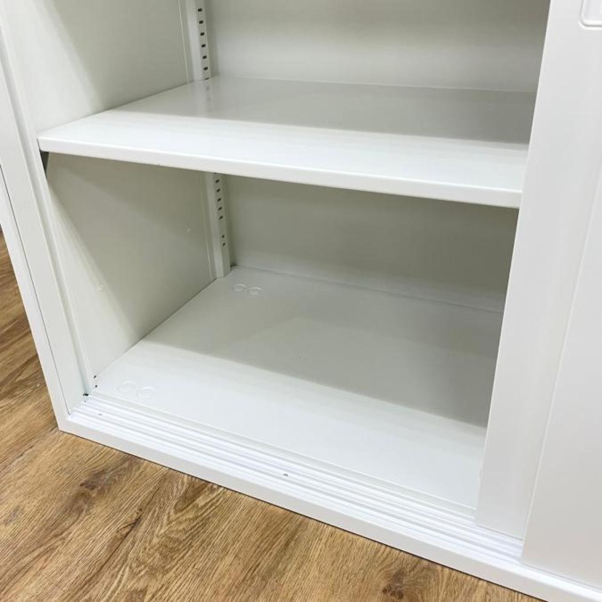 スライド式の扉のため導線を邪魔しません!使い勝手抜群の2枚引き違い書庫が入荷! ■オカムラ/レクトライン/ホワイト 2枚引き戸