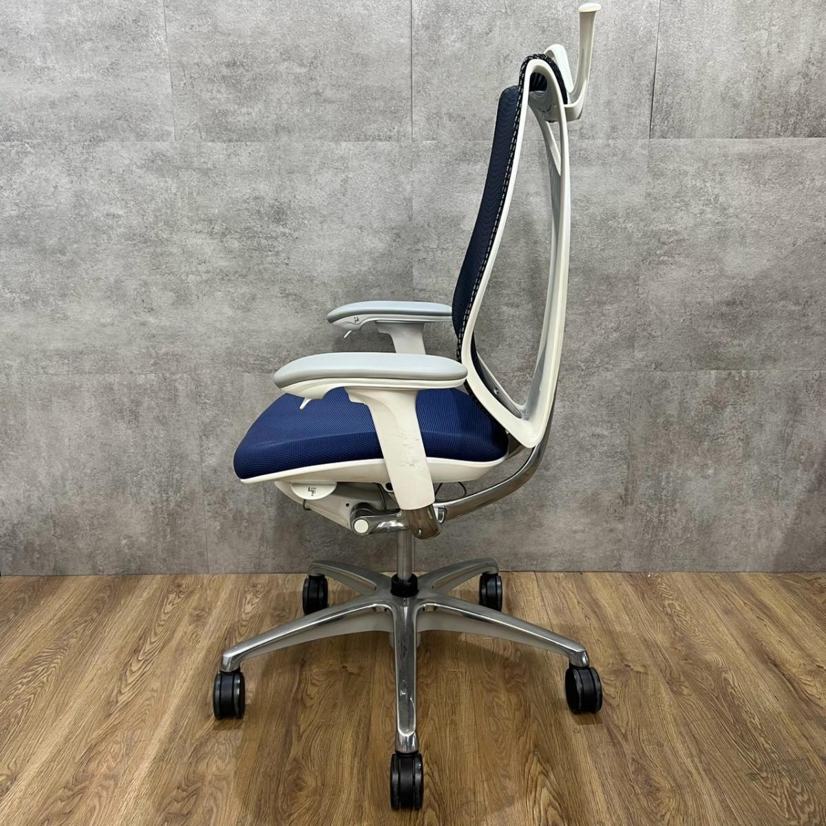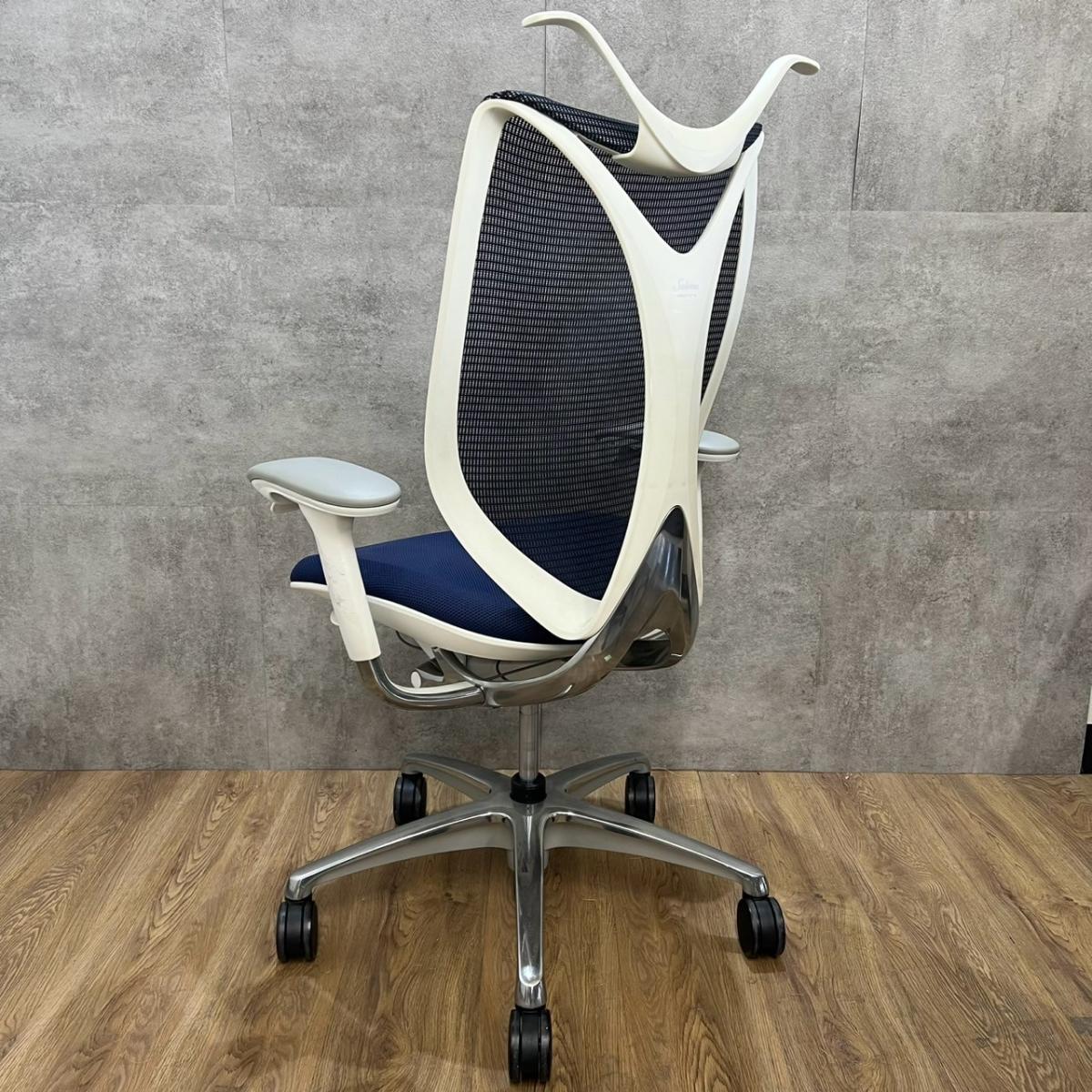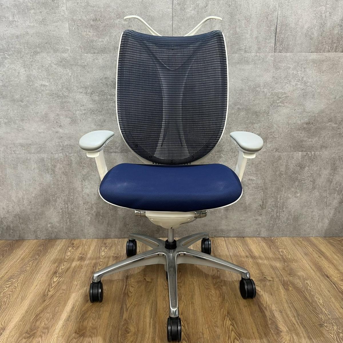 【前傾チルト付!流れるような美しいフォルムの最高級メッシュチェア!】■オカムラ(okamura)製 Sabrina(サブリナ) ハイバック 肘付き ■可動肘 ■背面メッシュ:アクアブルー 座面:ブルー ホワイトフレーム