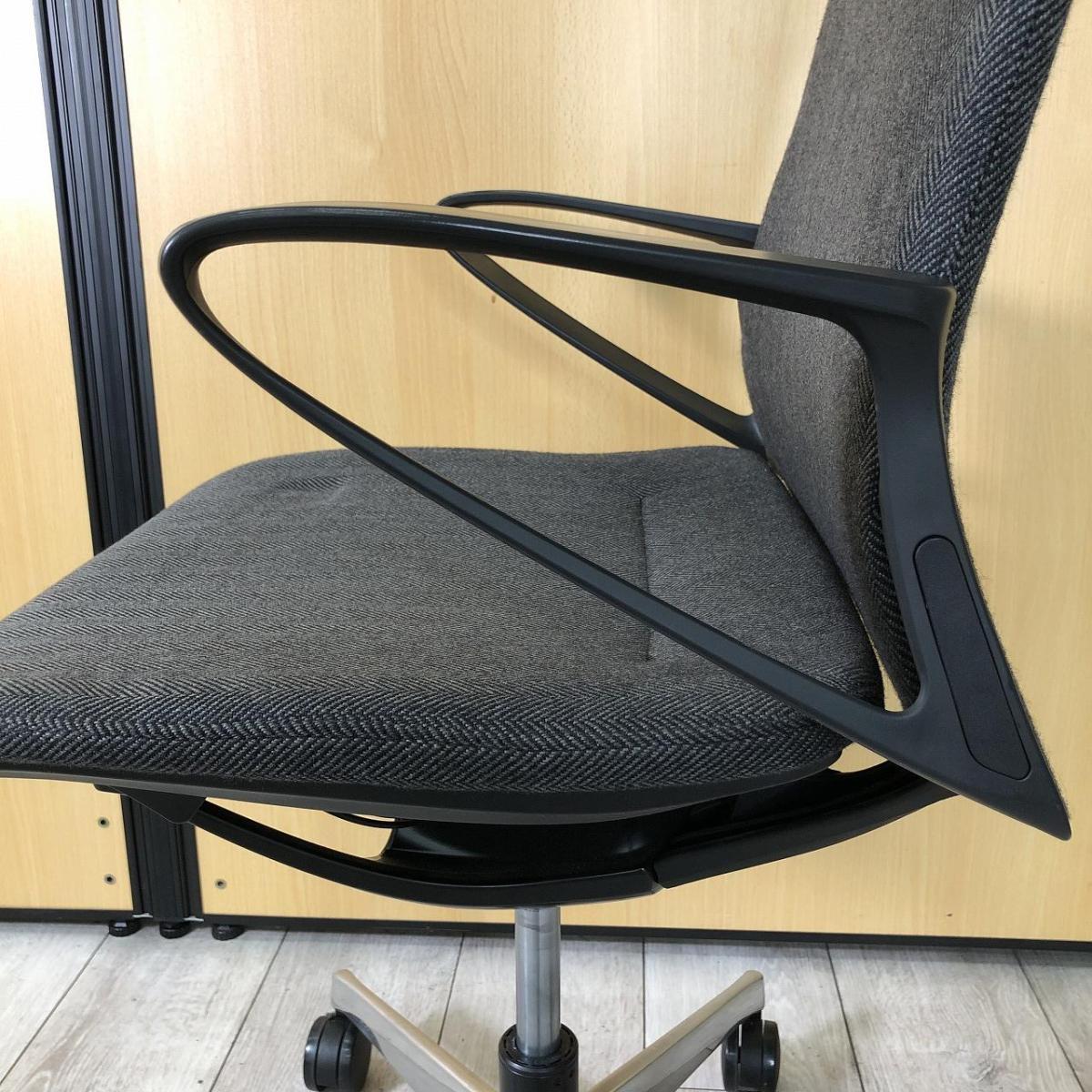 【在庫入替セール品!】スタイリッシュなデザインと確かな座り心地!会議室やモダンなオフィスの執務用としてもおすすめ! インテリア性の高い人気チェア! オカムラ/モード(mode)/ダークグレー デザインアーム フレーム(樹脂) ボディカラー(ブラック) クロス(ヘリンボーン)- 立川・八王子店
