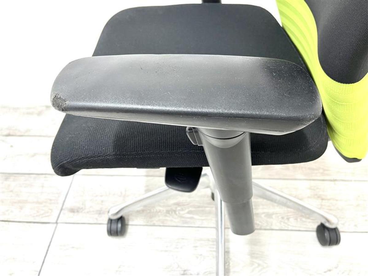 【快適な座り心地で作業効率アップ!】■オカムラ フィーゴチェア 可動肘付 シームレスタイプ ライムグリーン ハンガー付 ※肘に擦れ・削れ・欠けありのためお安く!