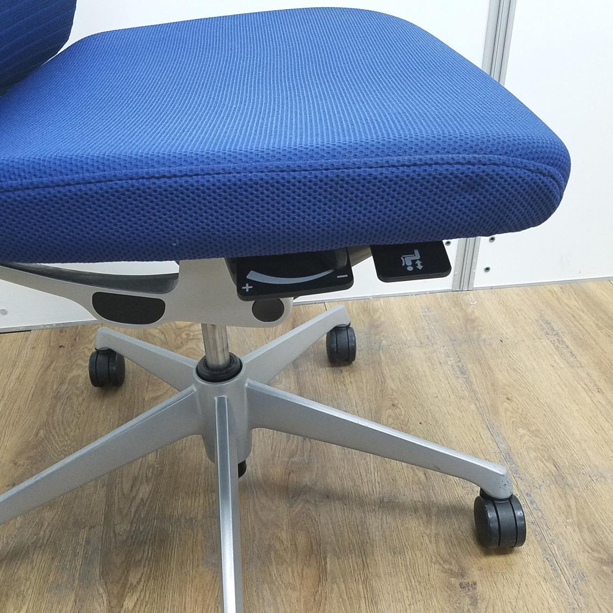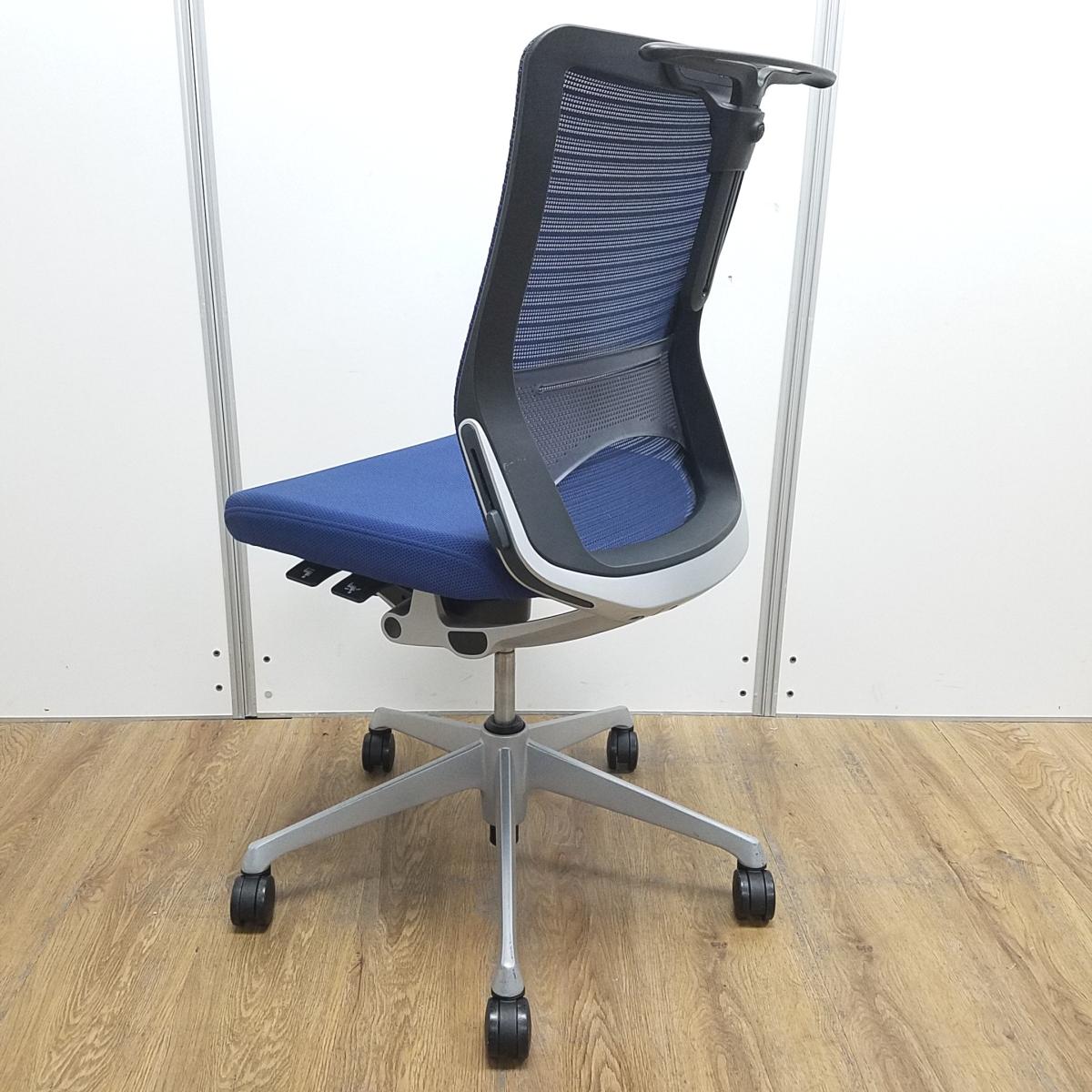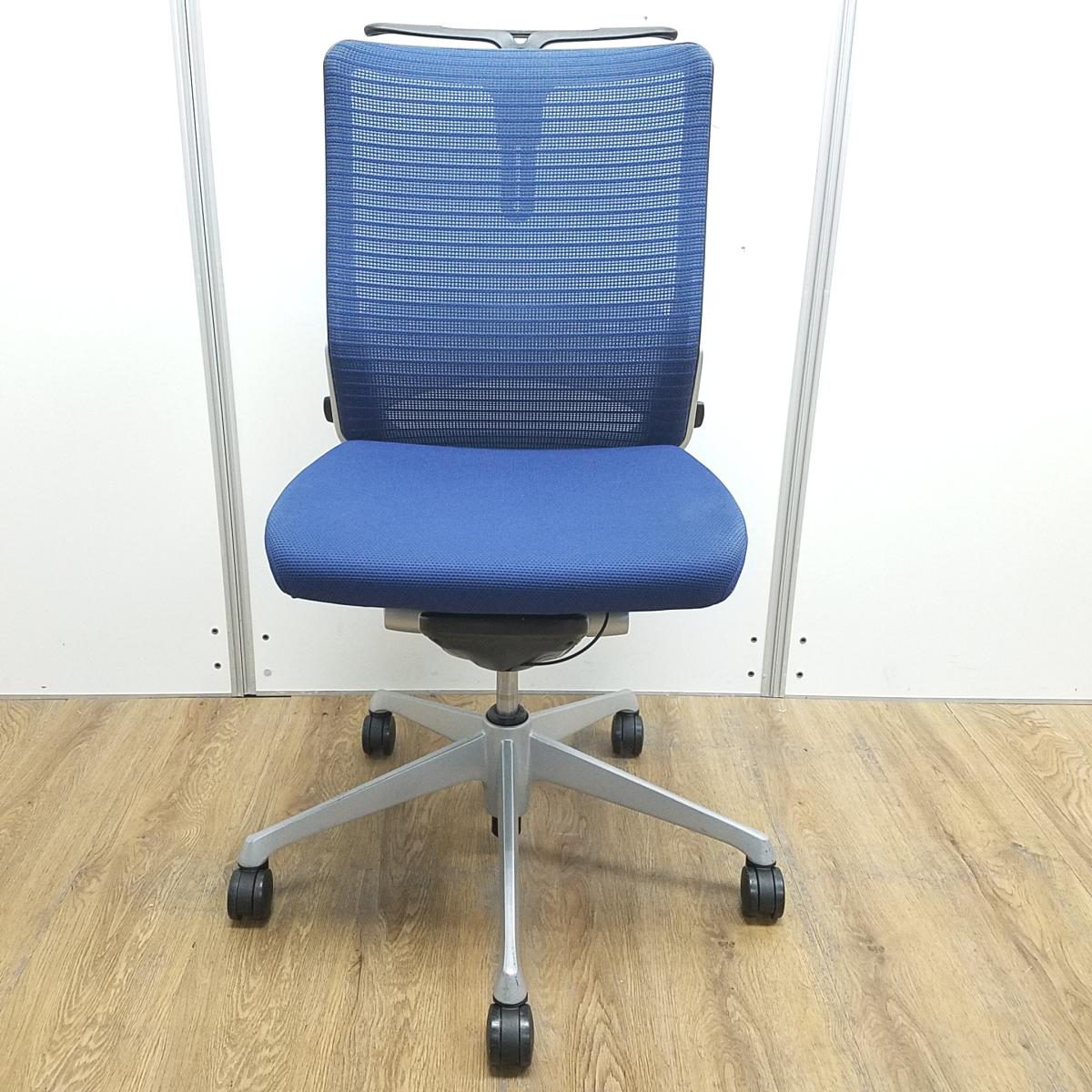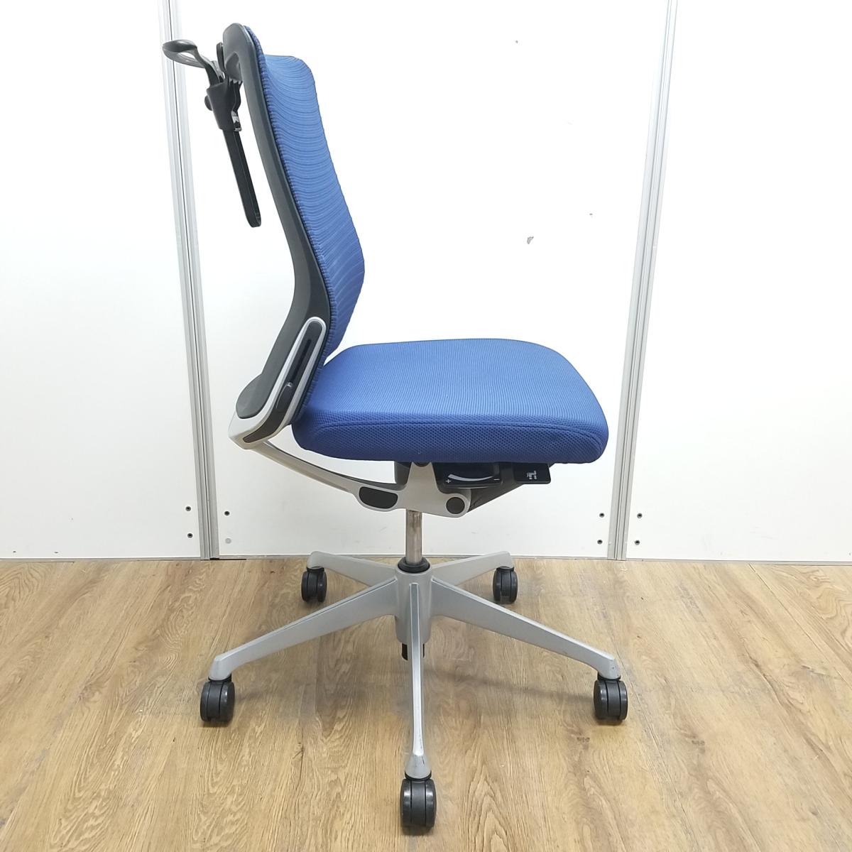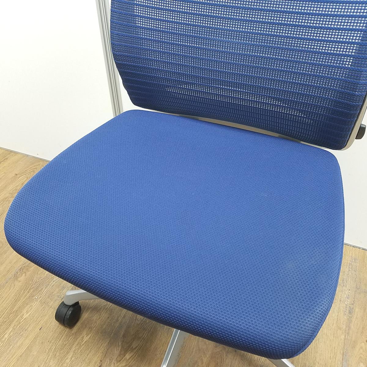 オカムラ製 コーラル ミディアムブルー 背面メッシュ ミドルバック 肘無し ランバーサポート コートハンガー シルバー脚 厚めのクッションで快適な座り心地を実現! どんな空間にも調和するデザインと最上級の操作性! 肘無しミドルバックチェア!!- 京都東寺店