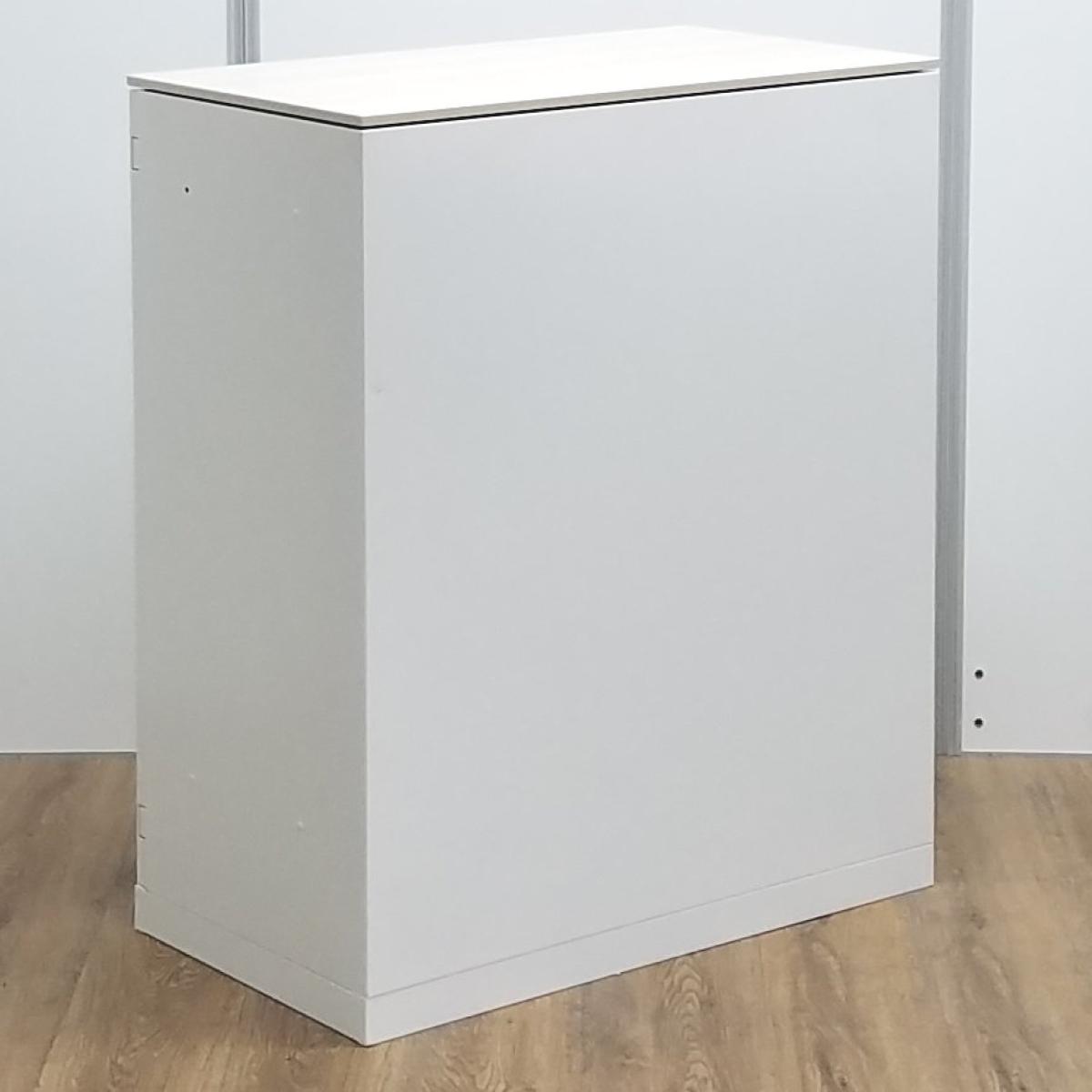 【オフィスの書類をスッキリ整理!取っ手がどの方向からでも開くマルチハンドル!】■オカムラ(okamura)製 レクトラインシリーズ 両開き書庫 ローキャビネット ■本体色:ホワイト ■シリンダー錠 ■ナチュラル天板付き