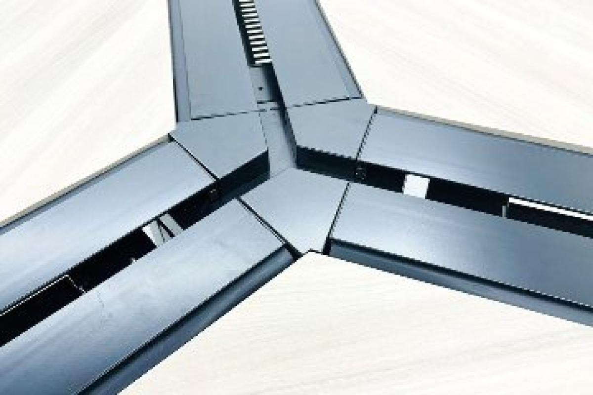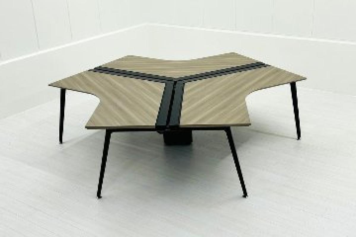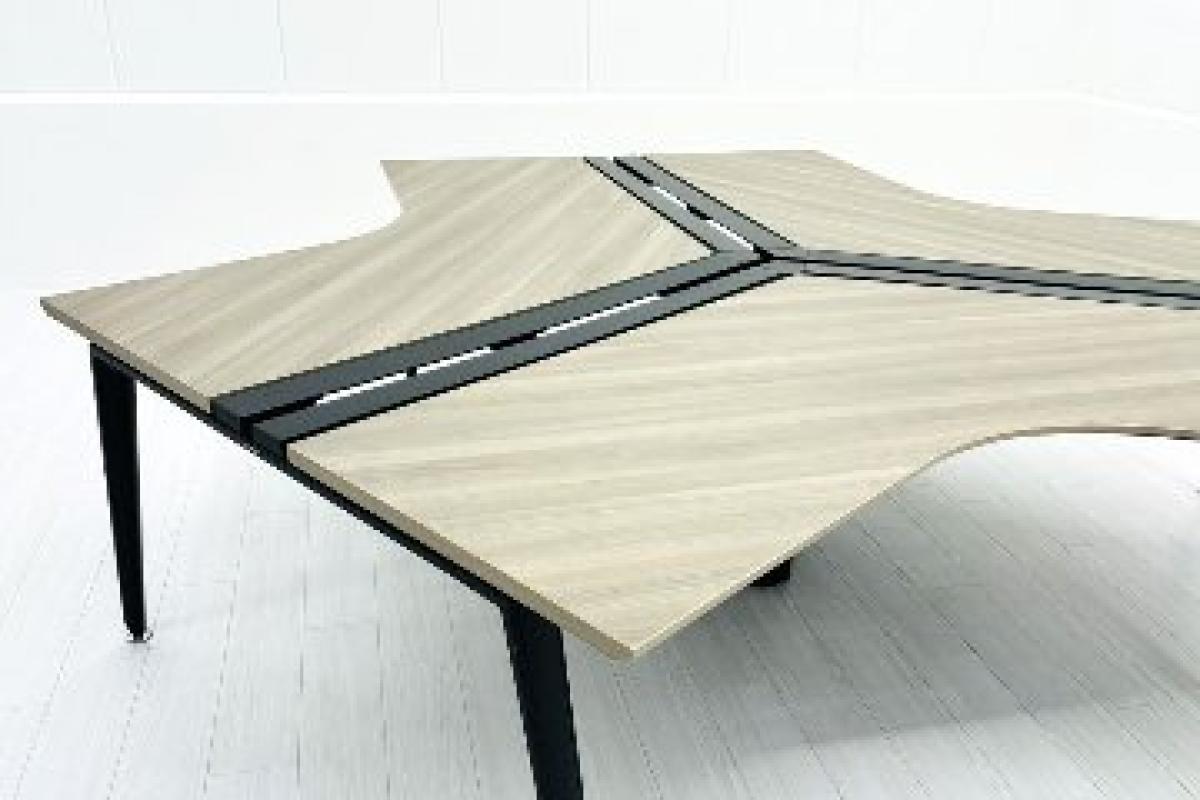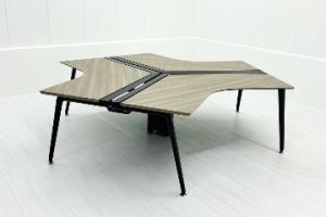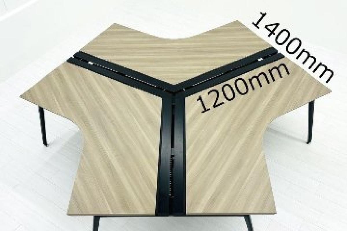 【外部倉庫在庫品】ブーメラン 最新木目 オカムラ製・【プリシード】120°天板シリーズの平机が入荷しました!1人当たりW1200サイズ。3名でご使用頂けます。珍しいデザインですが隣とは程よい距離のためコミュニケーションの取りやすいさ、デザインも魅了です!配線カバー開閉式【OI】- 日本橋店