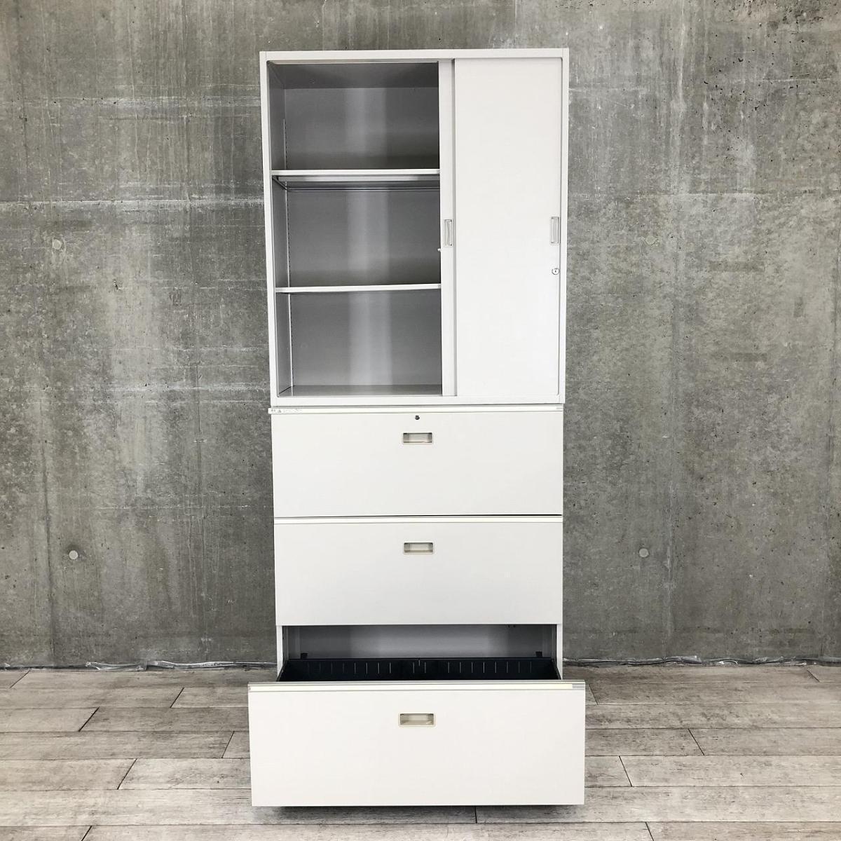 上段が引き違い(3枚)、下段が3段ラテラル(引き出し)の珍しい書庫セットとなります!