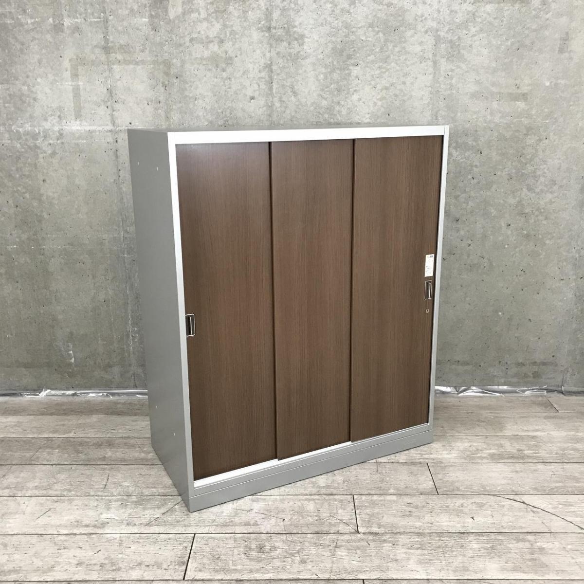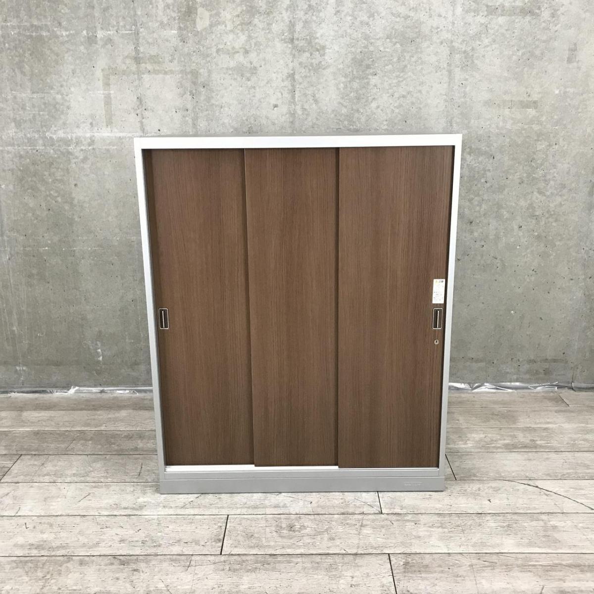 【スライド引き戸だから開閉スペースに困らない!希少なカラーのローキャビネット!】/オススメ(おすすめ) /人気商品【弊社使用欄:A01032746 】■3枚戸タイプ 引き違い書庫 ■本体側面/背面:シルバー 正面:木目調ブラウン ■シリンダー錠 ■ベース付き/okamura(オカムラ)製 レクトラインシリーズサーキュラーバリューCO2削減量の算出について