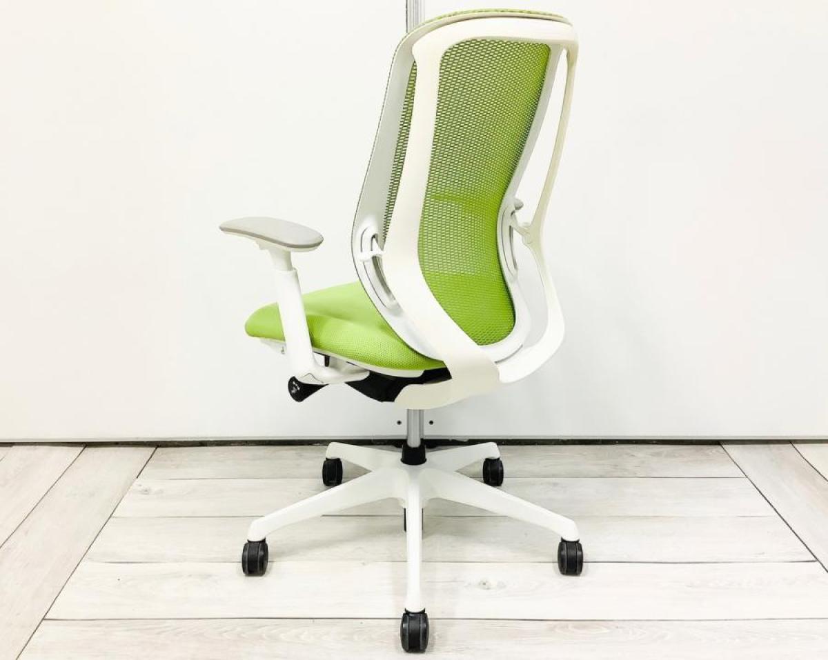 三次元曲面が身体にフィット!前傾チルト機能付き大人気メッシュチェア!清潔感と爽快感のある明るいグリーン×ホワイトフレーム仕様! ■オカムラ/シルフィーチェア(Sylphy)/ライムグリーン 肘付き ハイバック 背面メッシュ 可動肘- 立川・八王子店