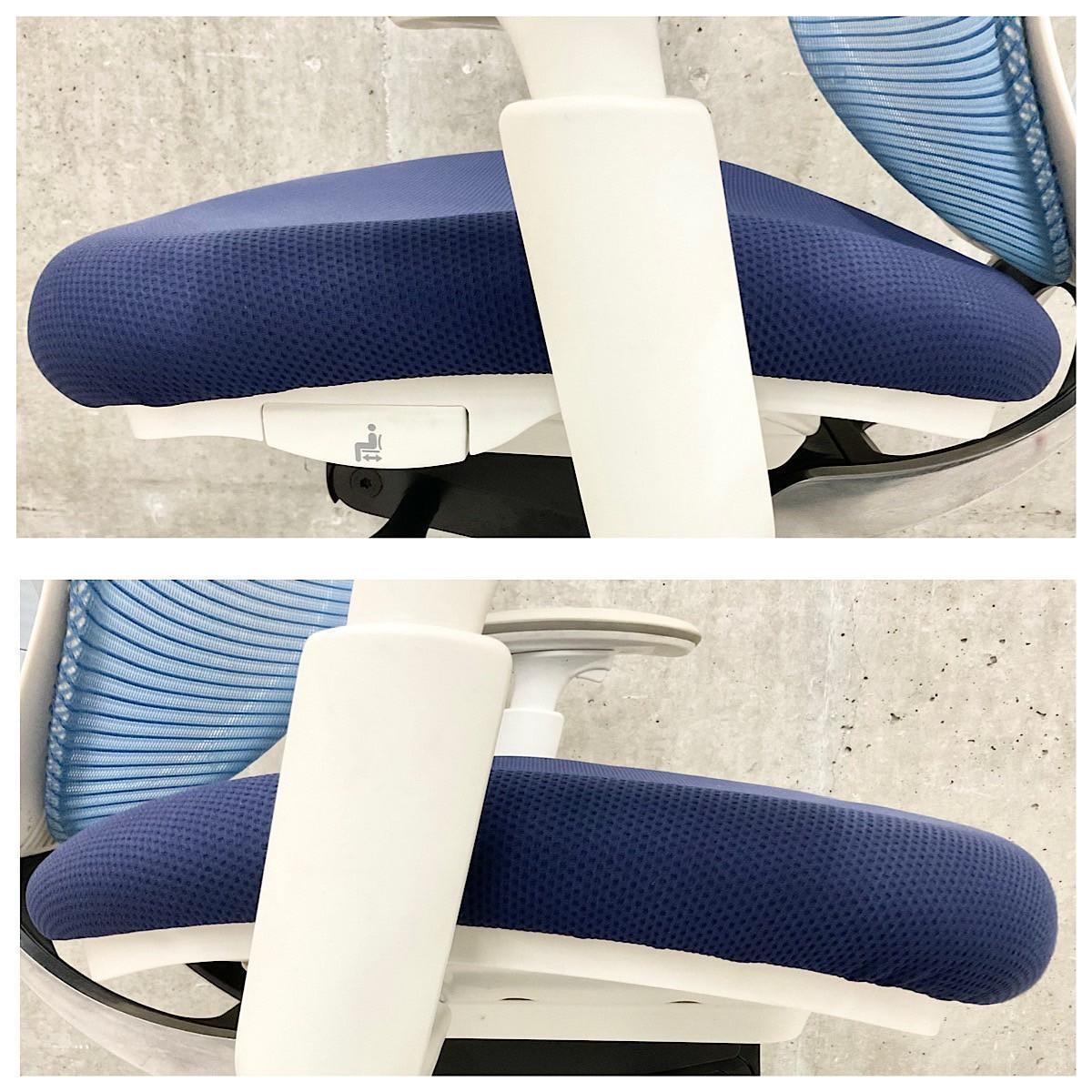 【T11】【T9】【K7】【商品入替のため、残り5脚限り】オカムラ製 サブリナシリーズ アクアブルー 背もたれ/アクアブルーx座面/ダークブルーのツートンカラー ホワイトフレーム アジャストアーム※可動肘 前傾チルト付 流れるような美しいフォルムの最高級メッシュチェア! 肘付きハイバックチェア!!