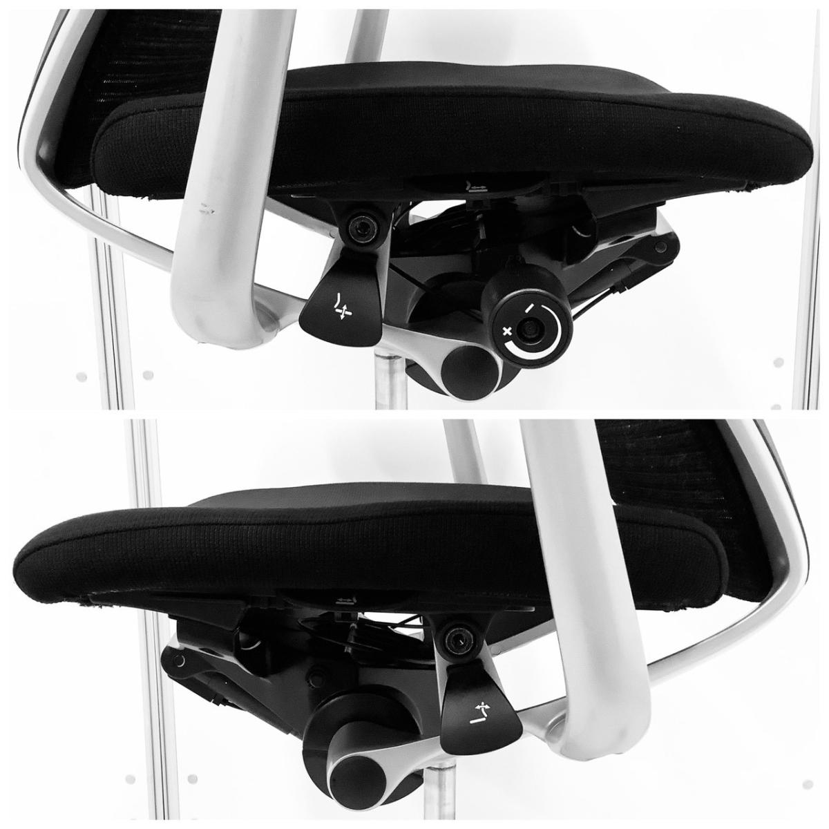 もちろん座り心地もコンテッサの直系ですから快適です。座面の素材はクッションとメッシュの2タイプあります。私、個人的には座面の中心部分でも外側でもテンションが変わらないクッション素材が、足を閉じても開いても快適なので推しです!"
