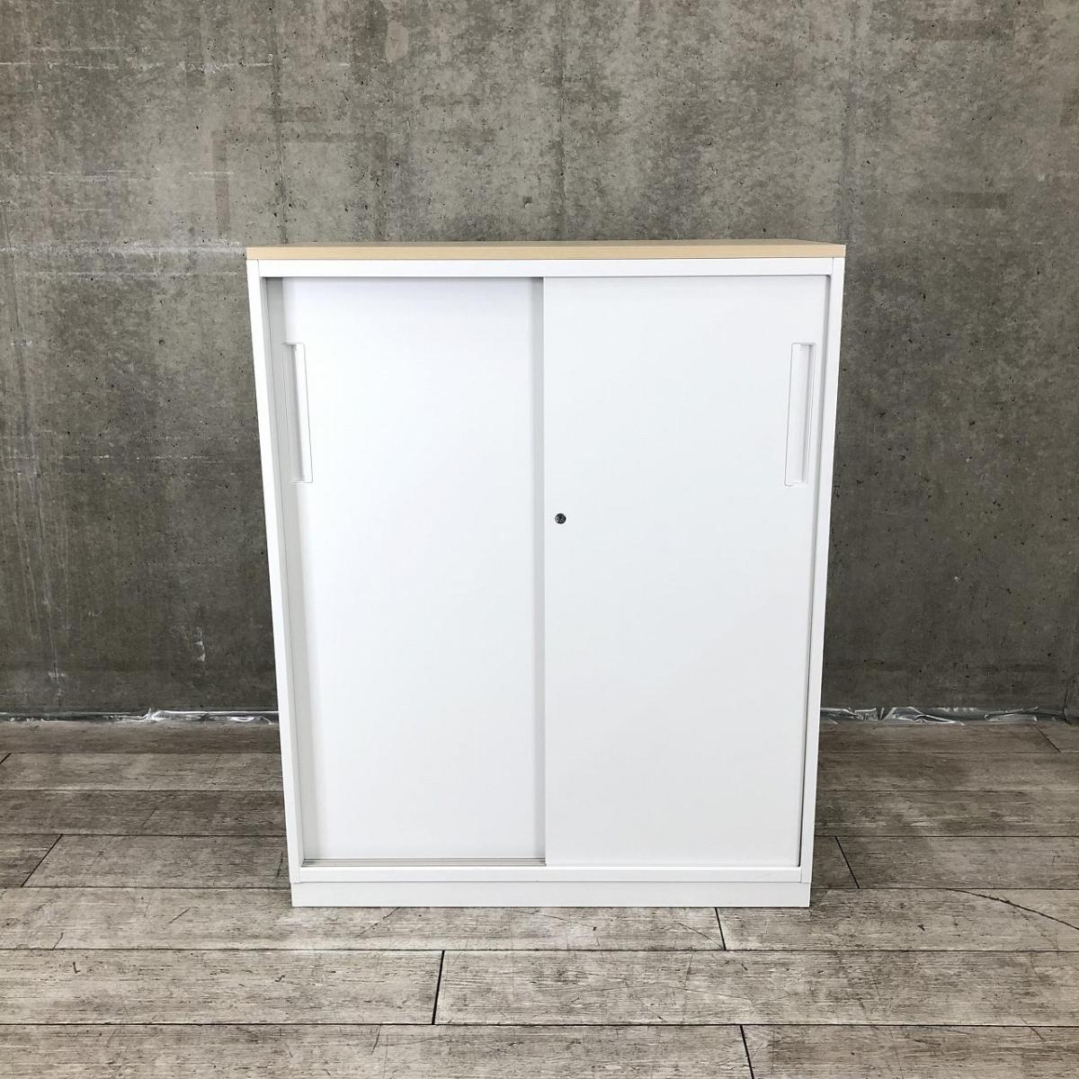 【4台限定】【書類を一気に収納!スライド式扉は開閉スペースに困らない!】■ウチダ(UCHIDA)製 ハイパーストレージ(HS)シリーズ 引き違い書庫(2枚扉) ローキャビネット ■ホワイト/天板:ナチュラル ■シリンダー錠- 高崎サテライト