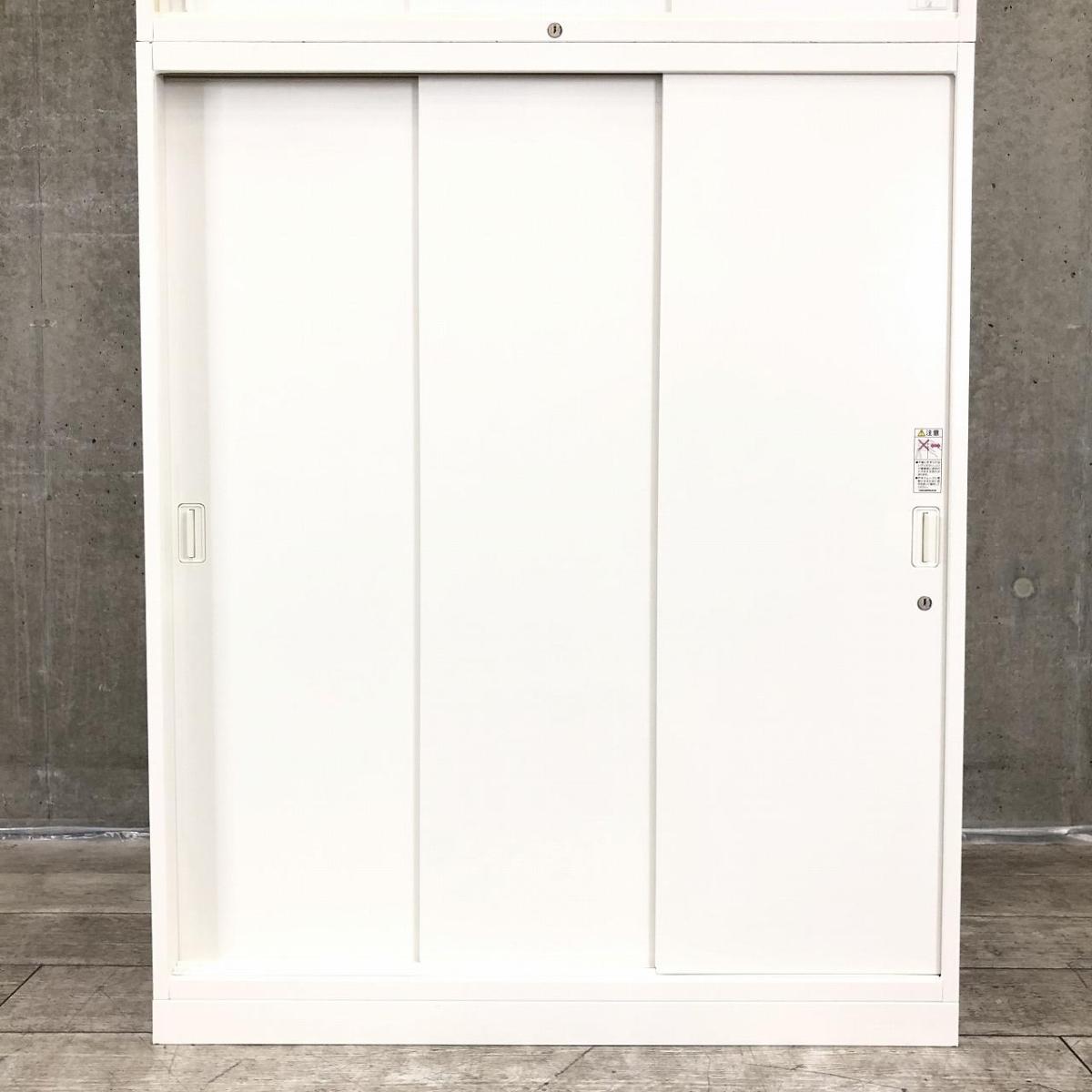 オカムラ製 レクトラインシリーズ ホワイト シリンダー W800xD450xH2150サイズ W800サイズ スリムサイズ 3枚戸タイプ ハイキャビネット スライド引き戸だから開閉スペースに困らない! 上下書庫セット 3枚引き違い書庫セット!!
