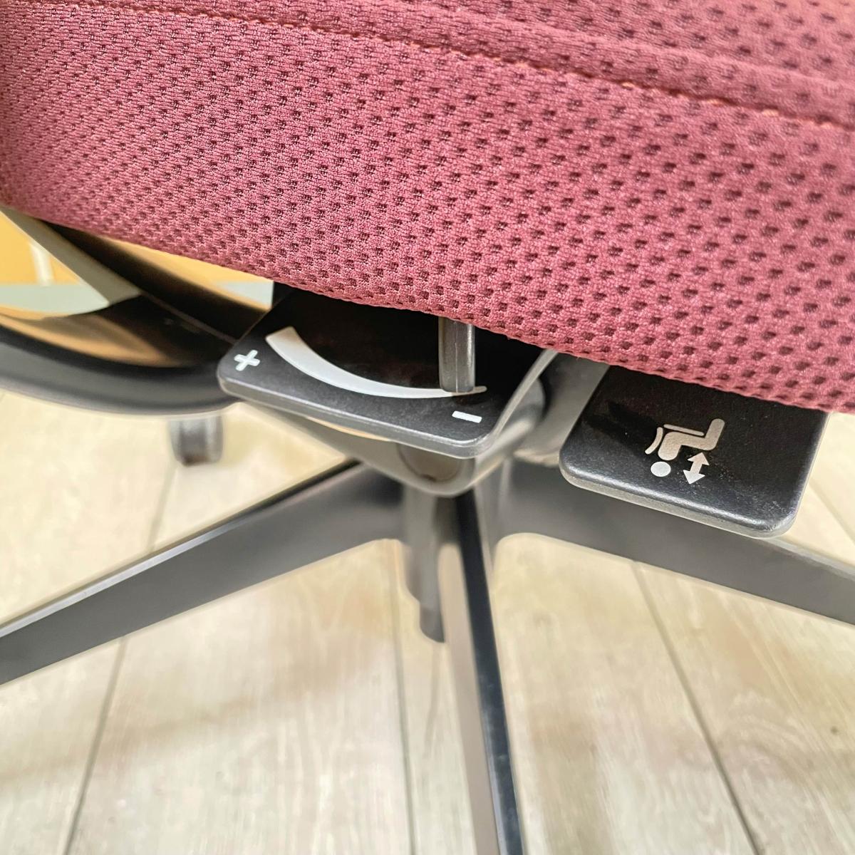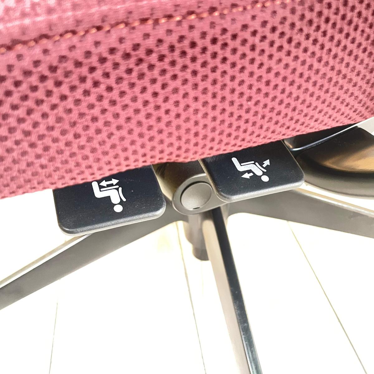 座面の高さや前後などの基本的な調整レバーが座面裏の前方に集約されており、姿勢を変えずに調節ができます。