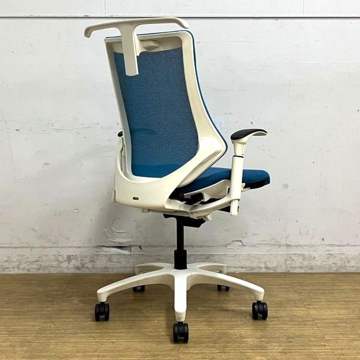 【姿勢の変化にフレキシブルに対応!スタイリッシュで座り心地も抜群な高機能チェア】■イトーキ(ITOKI)製 エフ(f)チェア 肘付き ハイバック 背面メッシュ ■可動肘・ハンガー付 ■ストロングブルー×ホワイトシェル ※日焼け有