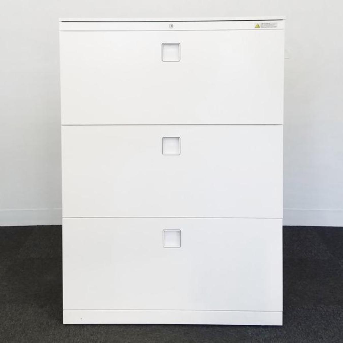 オカムラ レクトライン 3段ラテラル書庫 ホワイト天板 シリンダー錠 鍵付き ※取っ手部分に若干日焼けあり