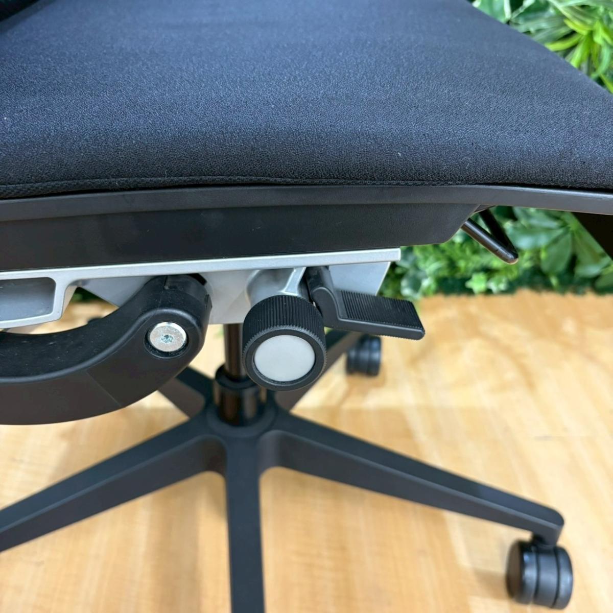 快適な座り心地に不可欠な調節機能である、上下昇降、座面の奥行き調整、リクライニングなどを備えており、操作もわかりやすく好評です。 特に、座面の奥行きは、座面下の左右に通った細いバーで調整でき、座ったままで軽やかに滑るように調整が可能です。 価格面では、新品では高めですが、中古は流通も多く、定価の3割前後の価格で高級チェアの座り心地を手に入れることができます!