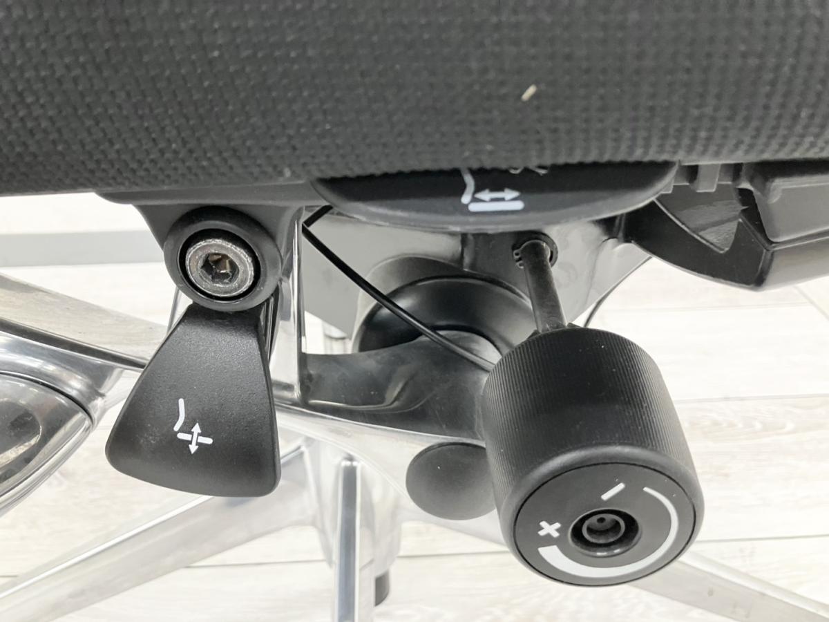 両手を自然に下ろした位置にあるレバーにて、座面の前後スライド調整(前後50mm)が可能です。