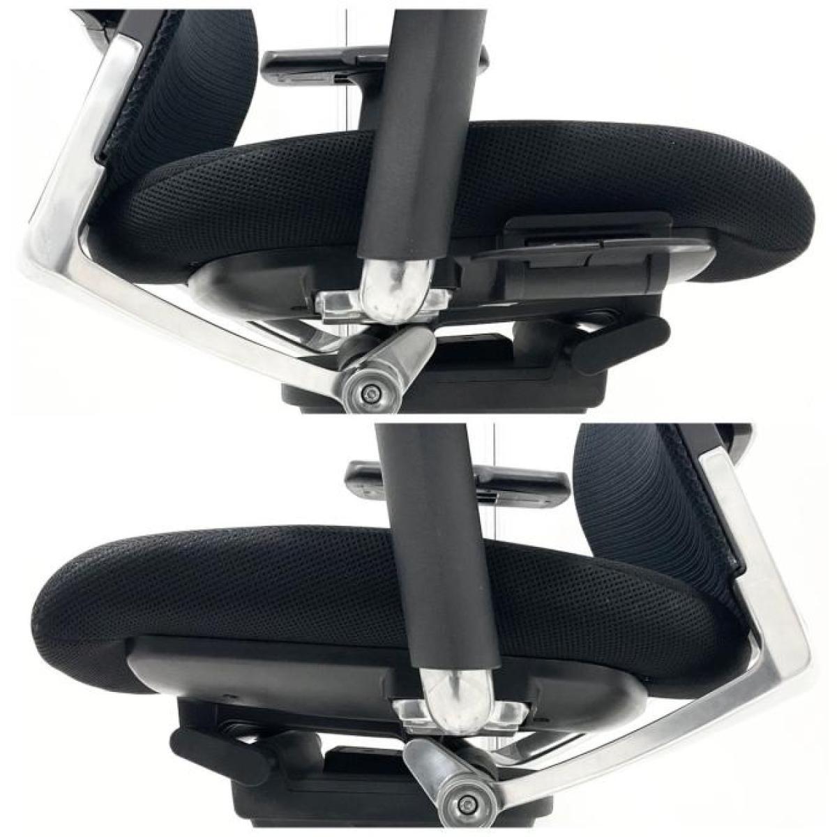 - 座る人の体格に合わせて、シート奥行きは前後54mm、高さ100mmの調整が可能です。また、調整レバーを座面シートの側面に設けることで、座ったままの姿勢で操作することができます。