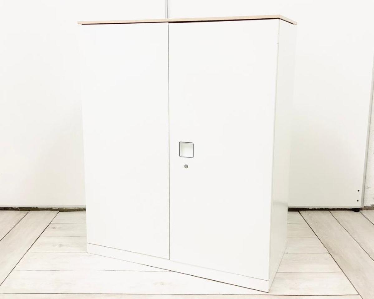 【オフィスの書類をスッキリ整理!取っ手がどの方向からでも開くマルチハンドル!】■オカムラ(okamura)製 レクトラインシリーズ 両開き書庫 ローキャビネット ■本体色:ホワイト ■シリンダー錠 ■ナチュラル天板付き