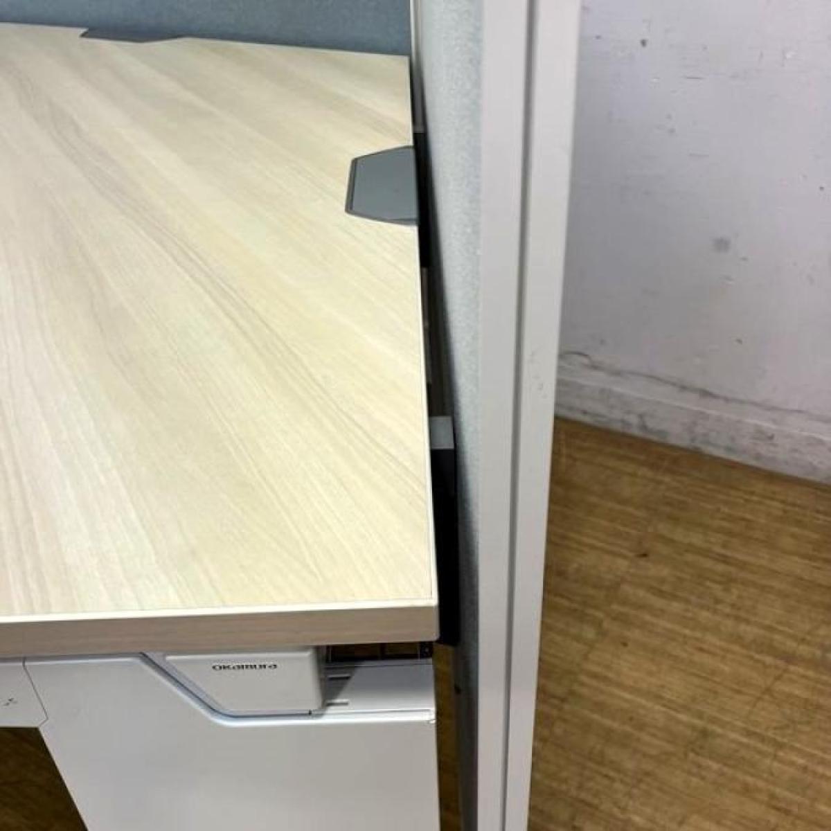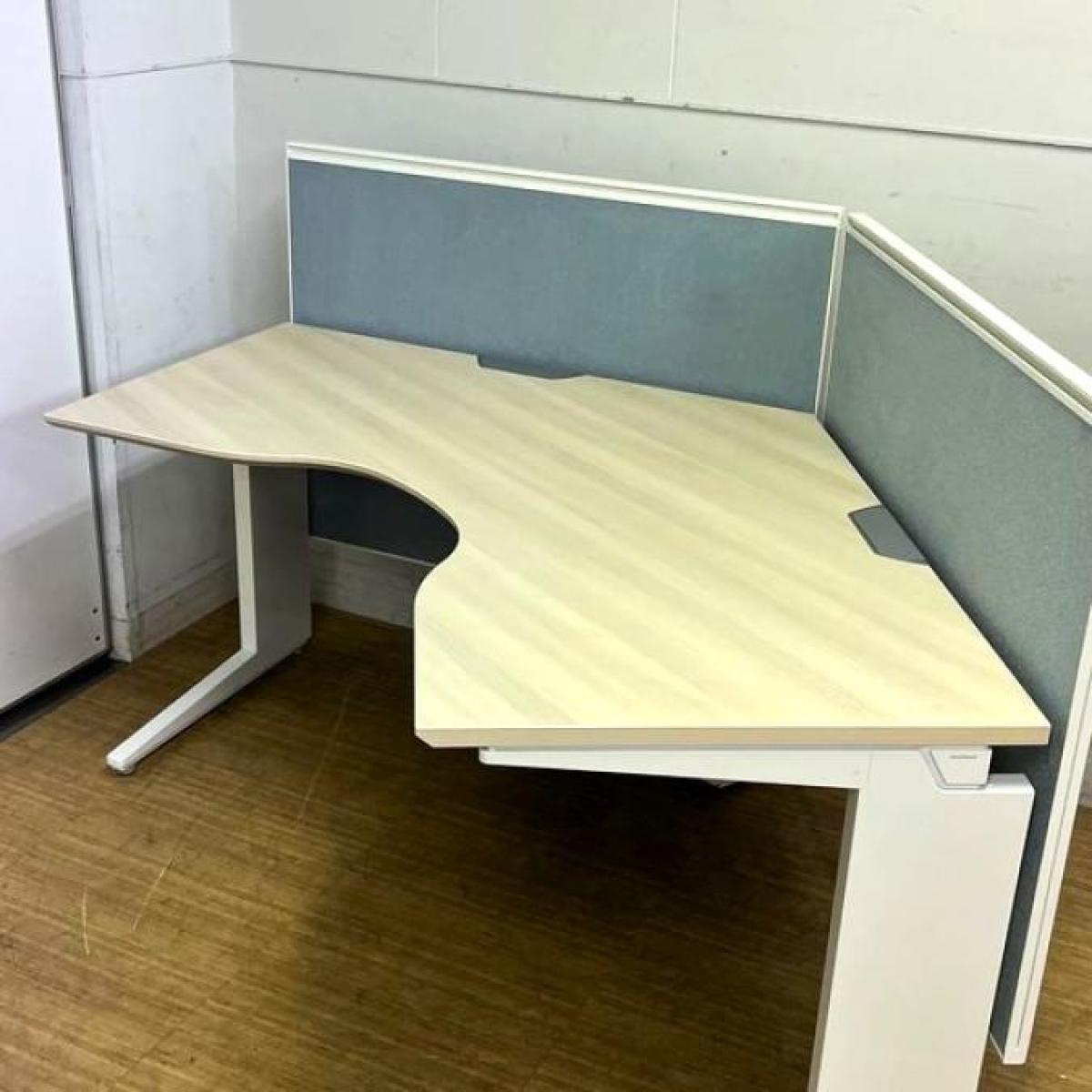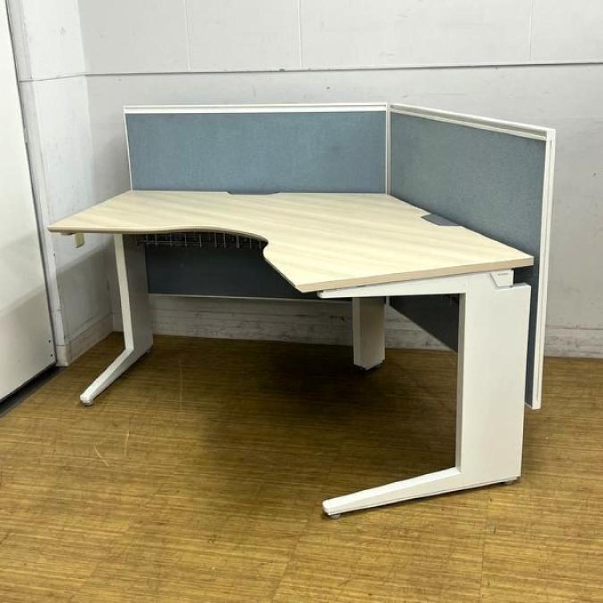 【在庫入替セール】【定価40万越え】オカムラ プロユニット 120°ブーメラン型デスク 天板プライズウッドライト×脚ホワイト バックパネル付き【ABW】- 名古屋千種店