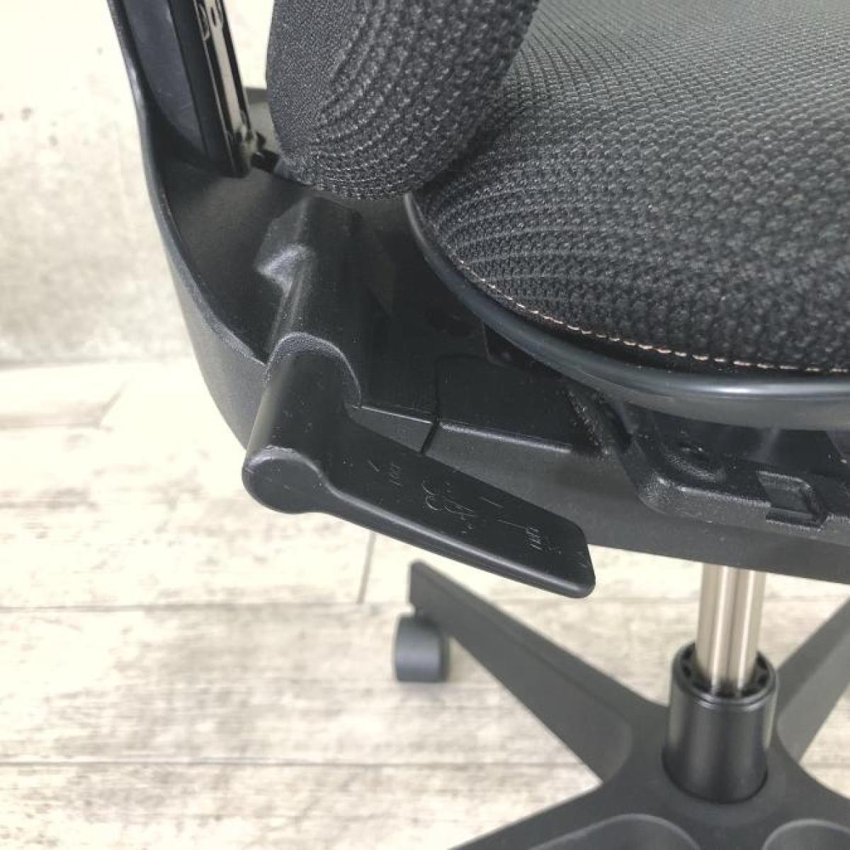 例えば、座面は、イトーキ独自の"ベンディングシート"という機構により、クッション、インターシェル、空洞という三層構造になっています。 この真ん中に挟まっているインナーシェルが、着座時の姿勢に合わせて体重を分散してくれるので、どんな姿勢でも体になじみ、疲労を軽減してくれます。 さらに、座面は前後に4センチほど奥行きを調整でき、前傾姿勢で座りたい、深く腰掛けたい、膝裏を圧迫されたくないなど、個人の好みに合った快適さにカスタマイズが可能となっています。