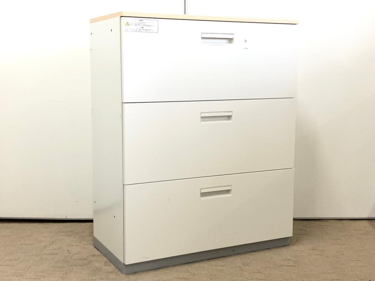 【ナチュラル調天板が人気の引き出し式書庫!】■プラス(PLUS)製 L6シリーズ 3段ラテラル ローキャビネット W900×D450㎜ ■ホワイト ■ナチュラル木目調天板付き ■シリンダー錠