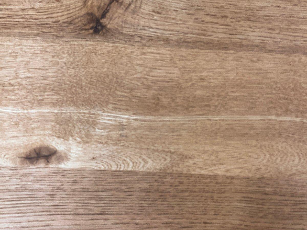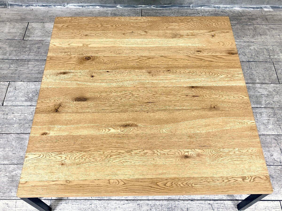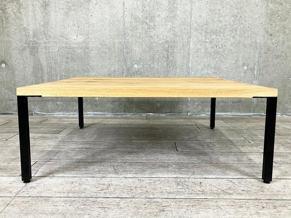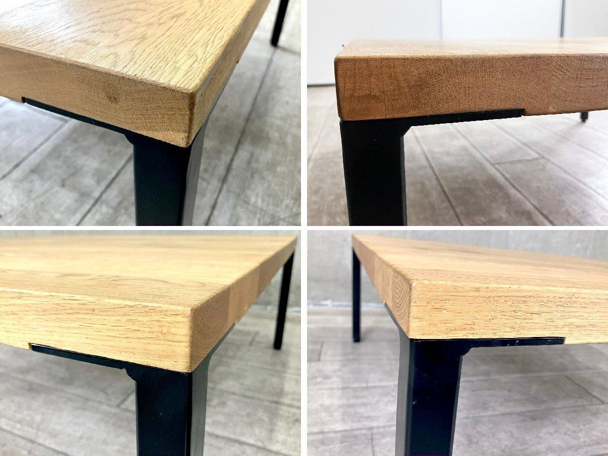 節の多いナラ材をオイル塗装で艶のないブラウン色に仕上げた、厚みのある木天板が特徴のコーヒーテーブル。表面には節が持つ自然な凹凸が残っています。脚部にはブラックスチールを合わせ、気軽にファクトリースタイルを取り入れることができるデザインに仕上げられています。