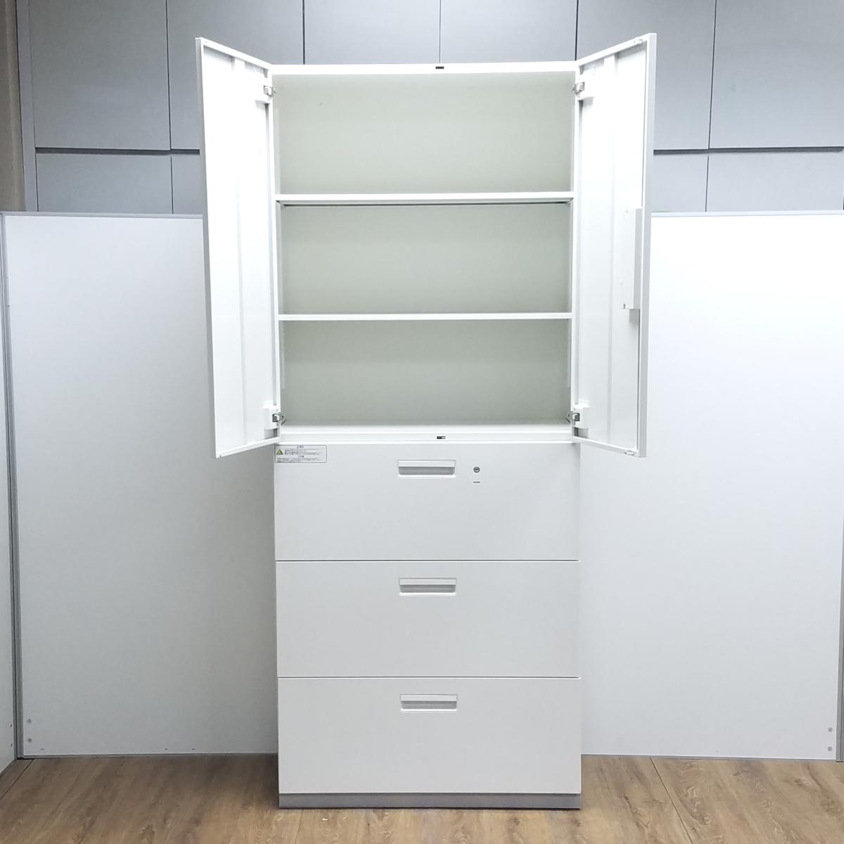 ★プラス製 L6 ホワイト W900×D450×H2150 両開き+3段ラテラル シリンダー錠 オフィスの書類をスッキリ整理! 両開きと引き出し式の人気の組み合わせ! ハイキャビネット 上下書庫セット!!- 京都東寺店
