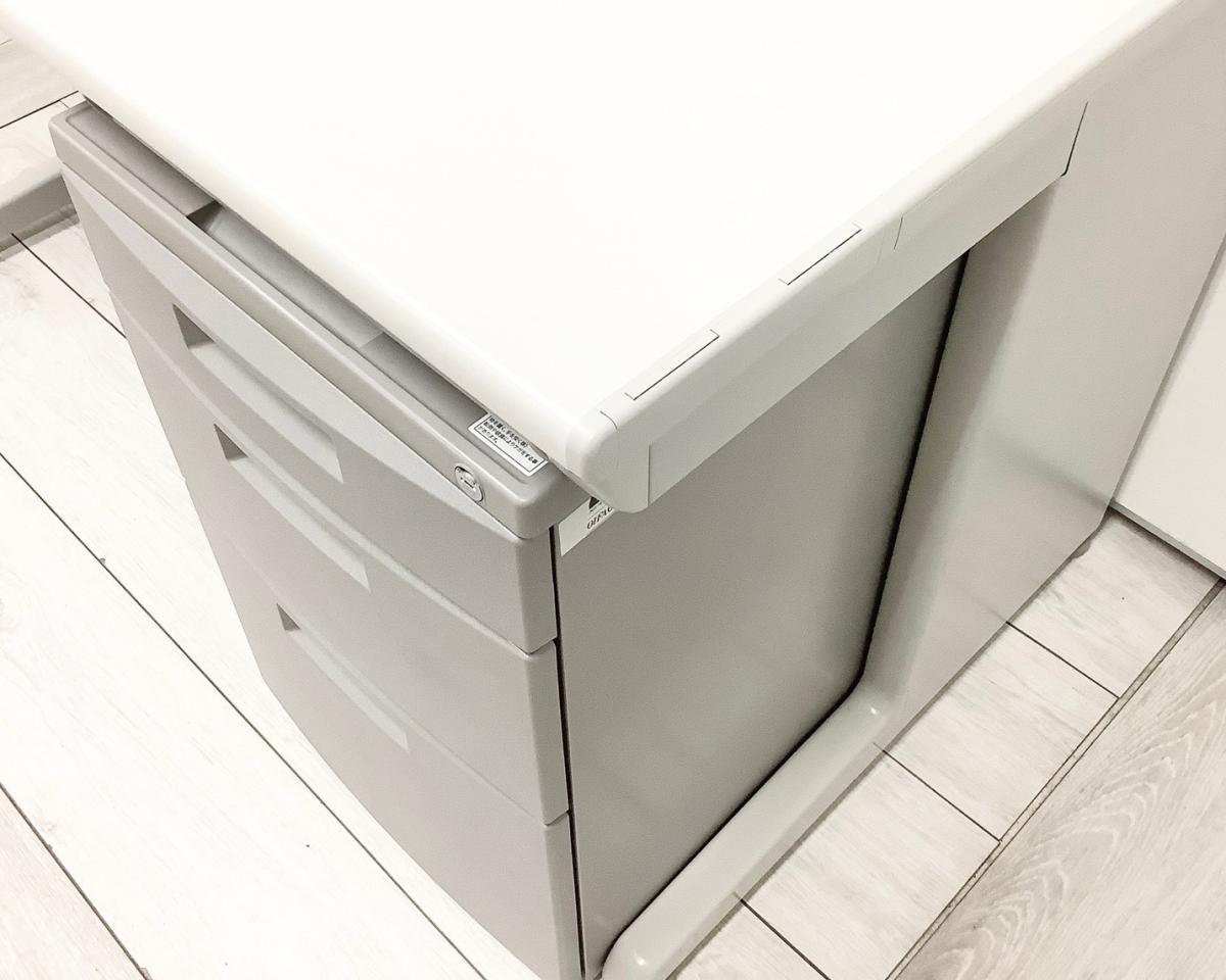 - 袖机のワゴンは、最下段がロング引出しになっており、従来より収納力120%アップ。