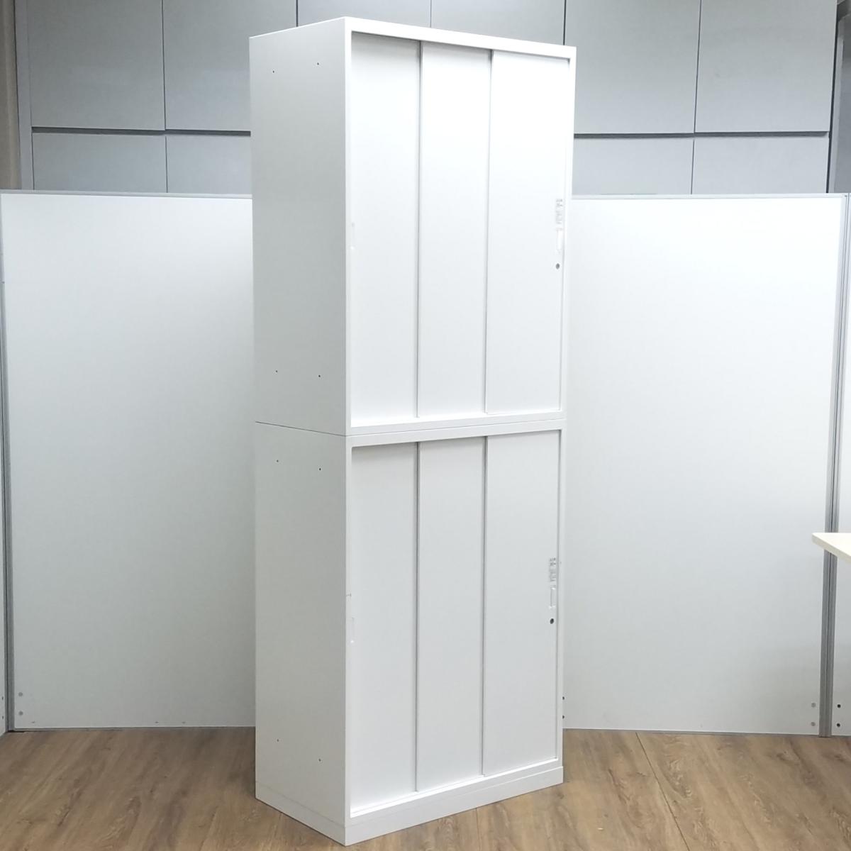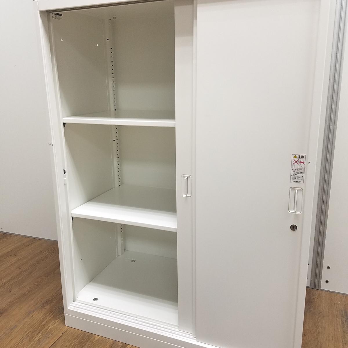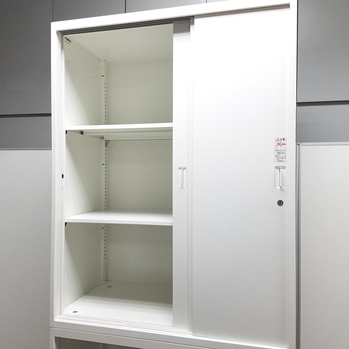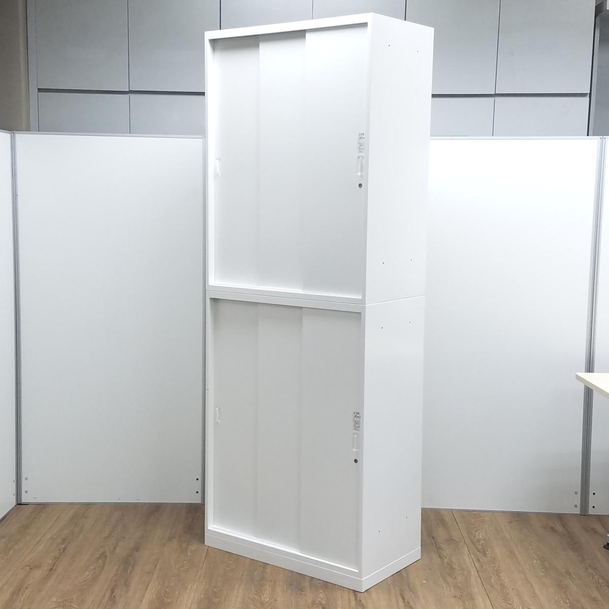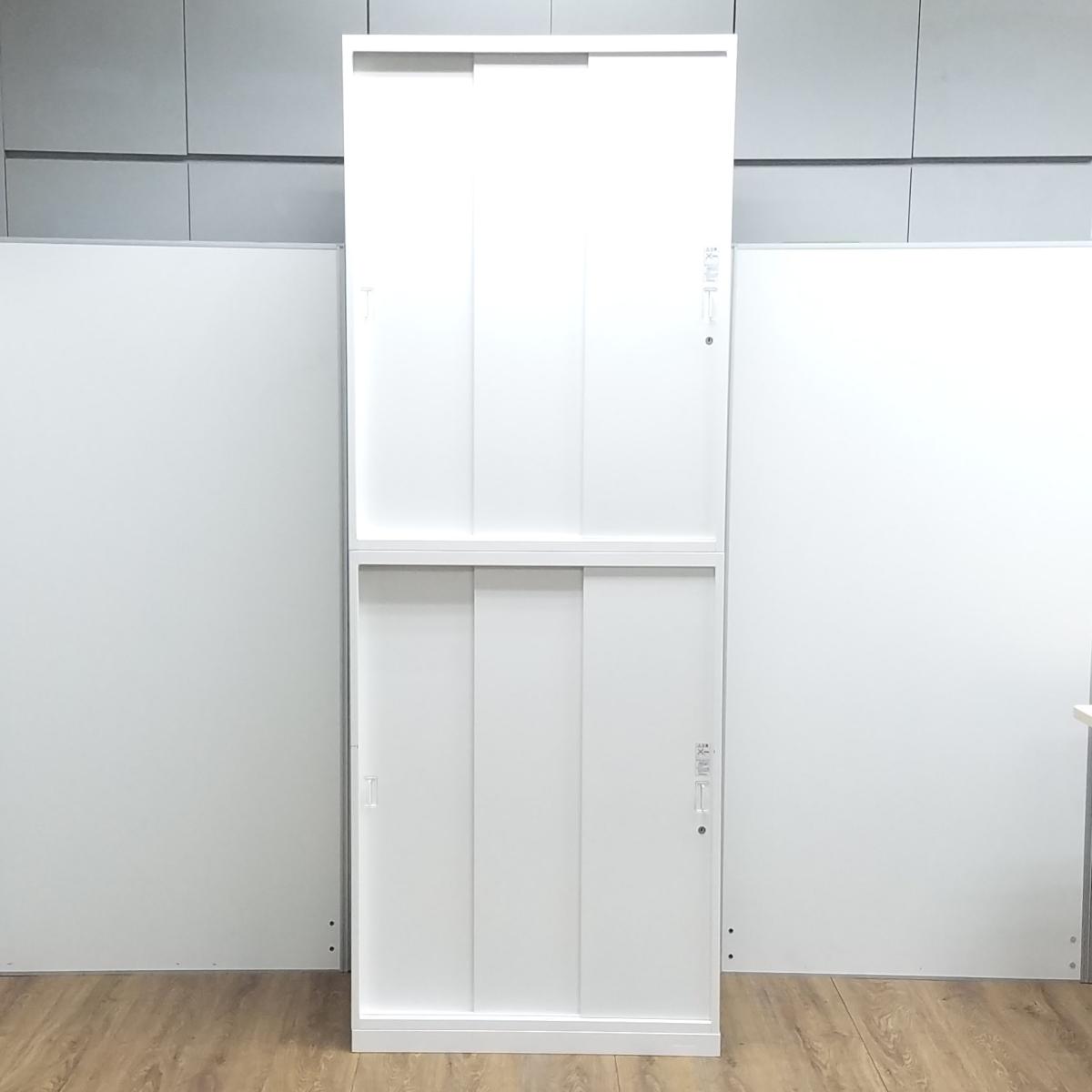 オカムラ製 レクトラインシリーズ ホワイト シリンダー W800xD450xH2150サイズ W800サイズ スリムサイズ 3枚戸タイプ ハイキャビネット スライド引き戸だから開閉スペースに困らない! 上下書庫セット 3枚引き違い書庫セット!!- 京都東寺店
