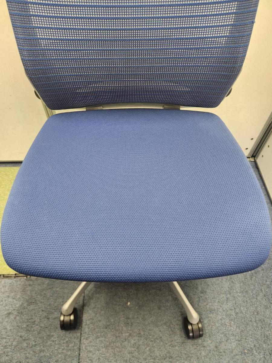 ★【K12】【T12】【商品入替のため、残り6脚限り】オカムラ製 コーラル ミディアムブルー 背面メッシュ ミドルバック 肘無し ランバーサポート コートハンガー シルバー脚 厚めのクッションで快適な座り心地を実現! どんな空間にも調和するデザインと最上級の操作性! 肘無しミドルバックチェア!!