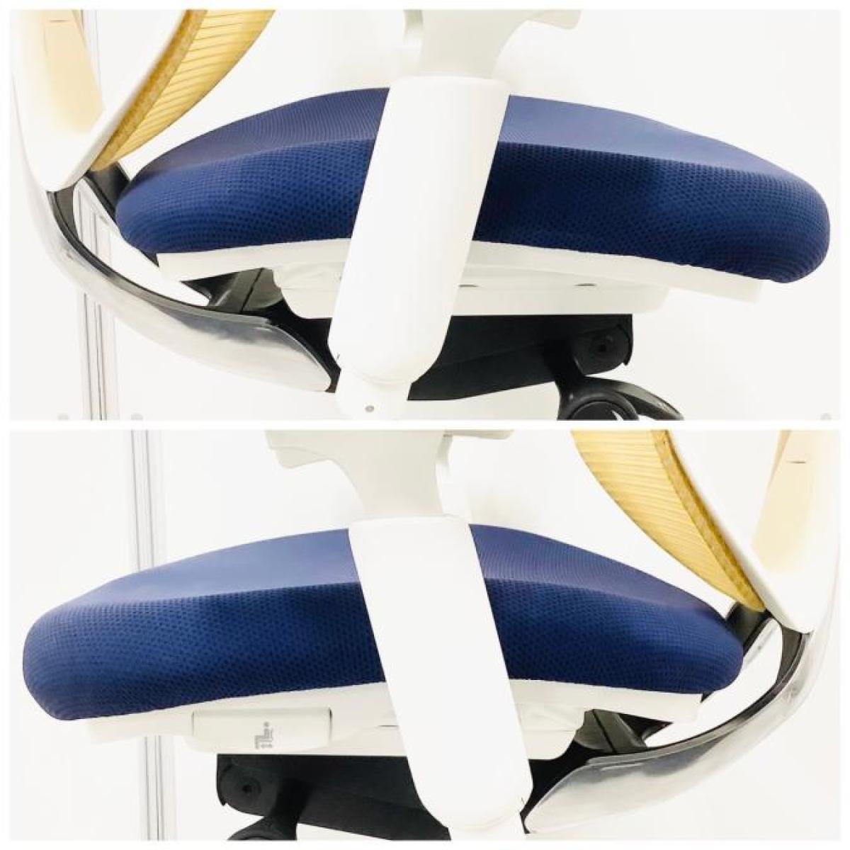 - 椅子と背が連動する「シンクロリクライニング」。リクライニング角度は直立ポジションから前方に10度、後方に23度です。