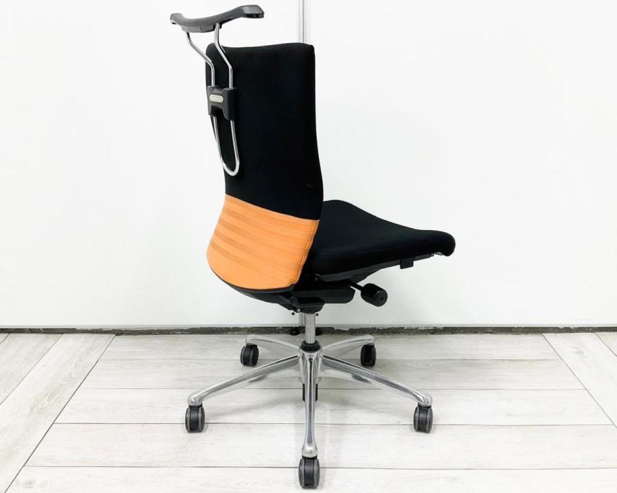 【人間工学に基づいた快適な座り心地!背あてのしなやかな曲線が背中にフィット!】■オカムラ製 フィーゴチェア (feego) 肘無ミドルバック シームレスタイプ ■肘無 ■ブラック×オレンジ ※コートハンガー外し跡のある商品となります。【入替セールにつき30%OFF!】