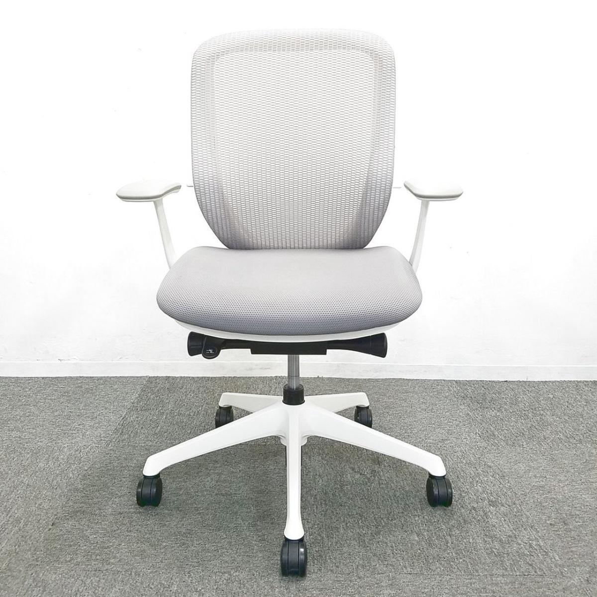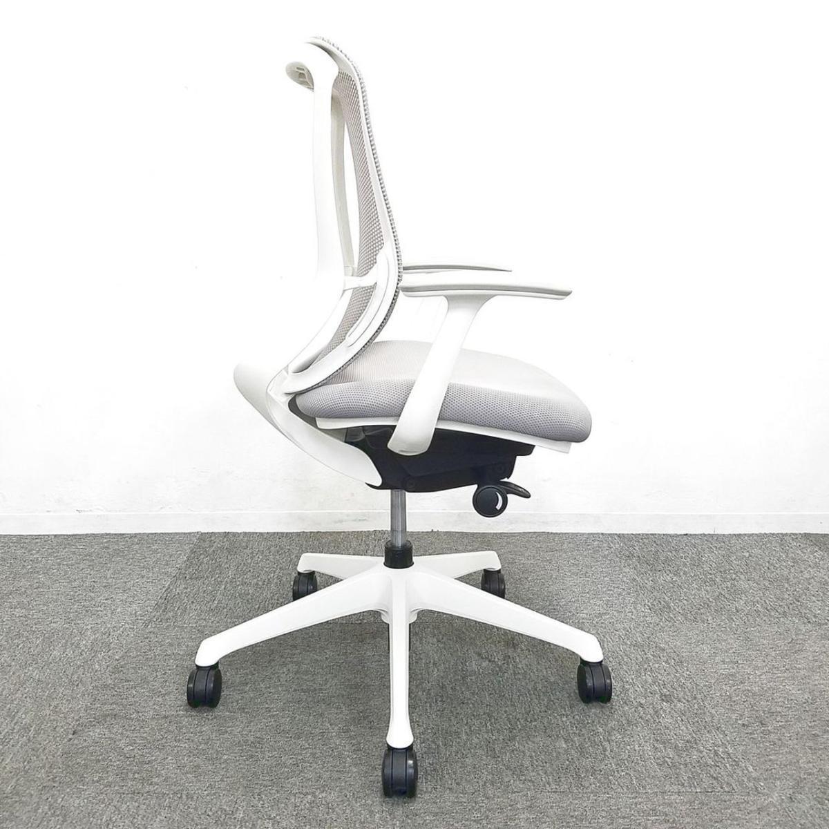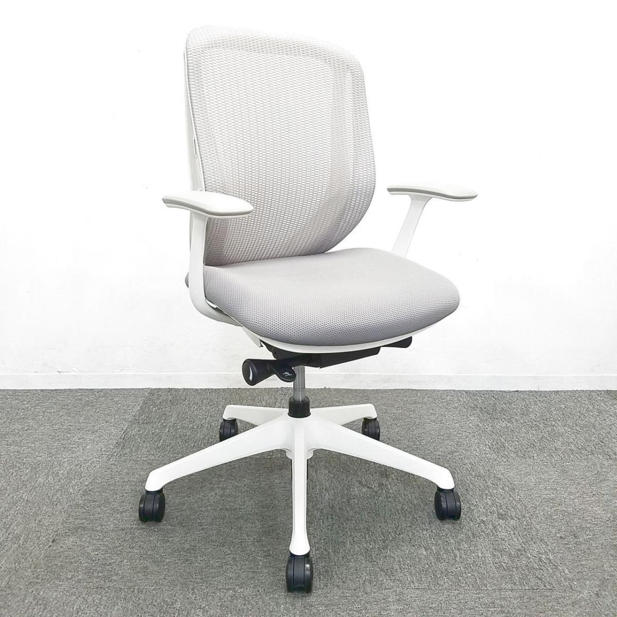 【1脚限定の為、クレジット決済優先!】オカムラ製 シルフィーシリーズ ライトグレー ホワイトフレーム デザインアーム※固定肘 コートハンガー 樹脂脚 メッシュ仕様 大人気前傾チェア 背のカーブを変えられる新感覚のオフィスシーティング 肘付きローバックチェア!!