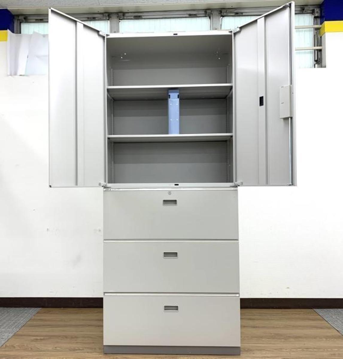 【在庫お探しいたします!/予約依頼商品】イトーキ製のハイキャビネット(両開き書庫+3段ラテラル書庫)【シンラインシリーズ/ニューグレー色】 *良品を格安で!「オフィスバスターズ福岡南店」は、福岡を拠点として、全国へ中古オフィス用品・オフィス家具を提供しております