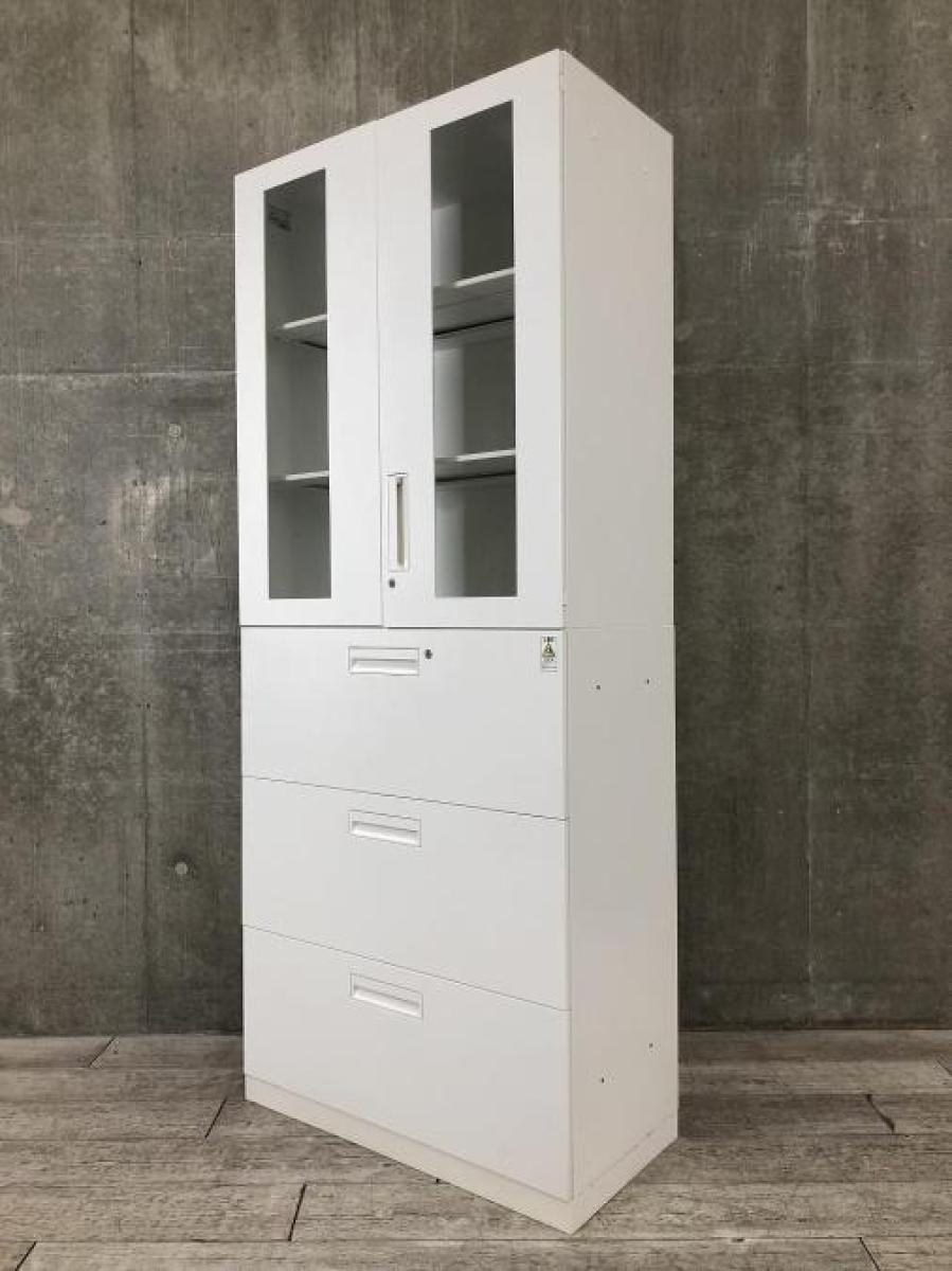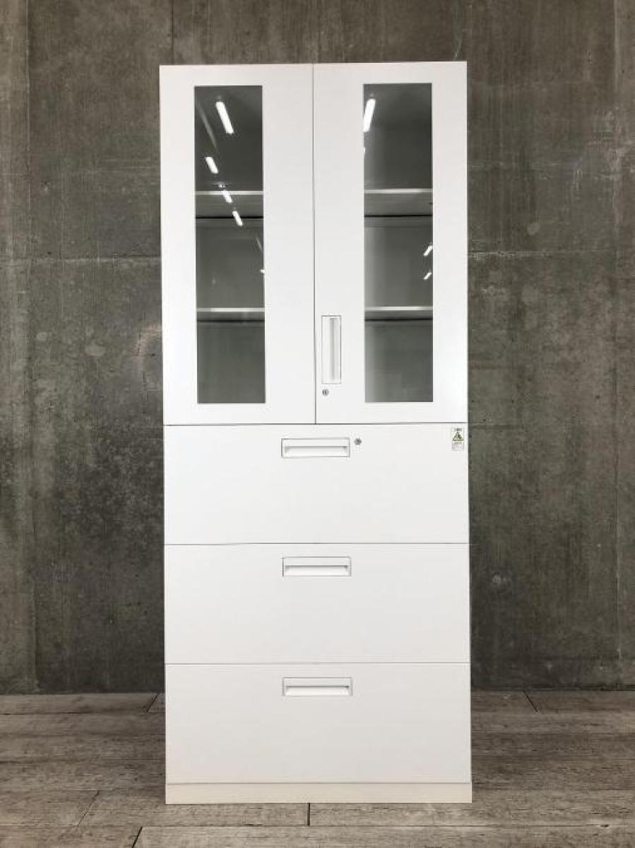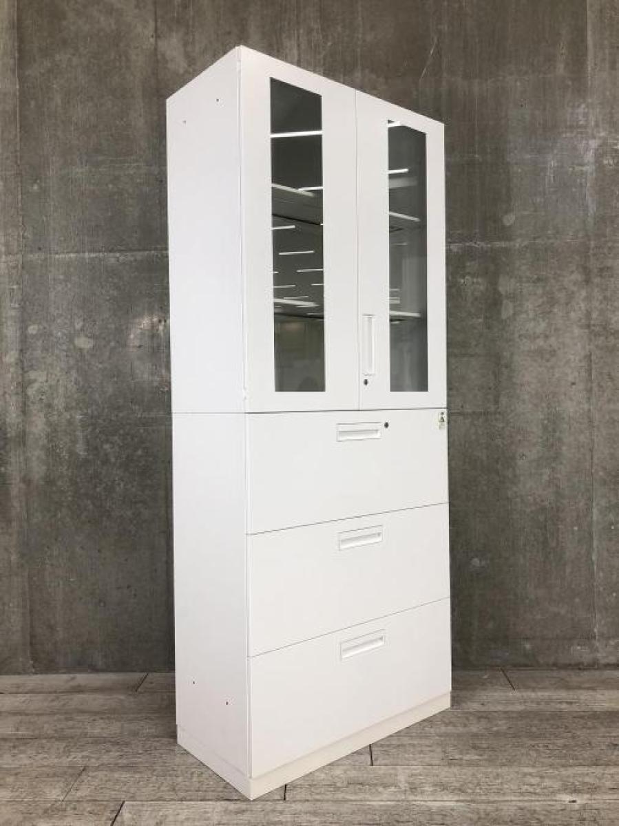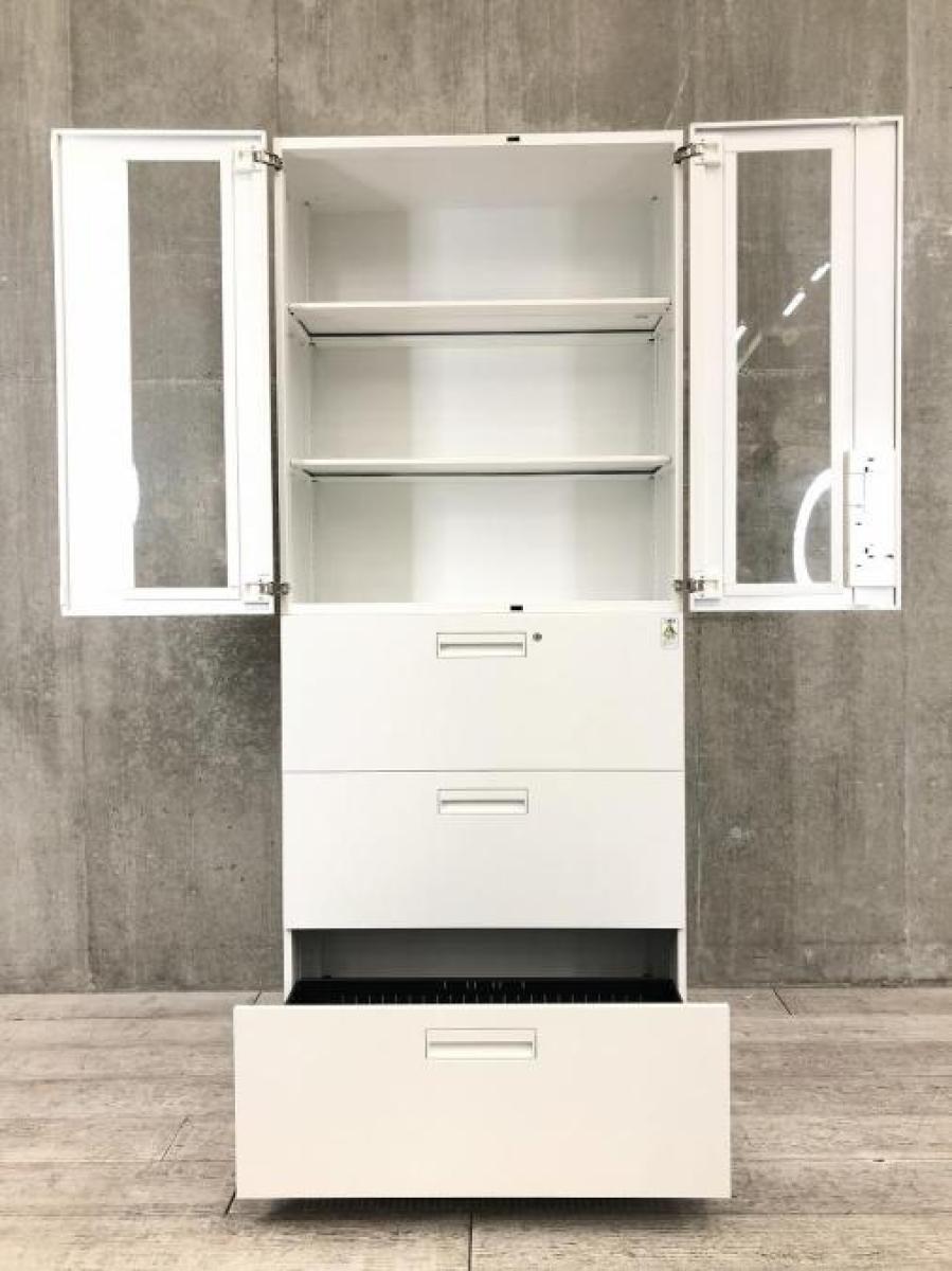 【書類の小分けに便利なクリスタルトレーと両開きタイプのコンビ!】■コクヨ製 エディア 上下書庫セット(上:両開き 下:クリスタルトレー)ホワイト 《オフィスバスターズ福岡博多店は、福岡を拠点として、日本全国へ中古オフィス用品・オフィス家具を提供しております》