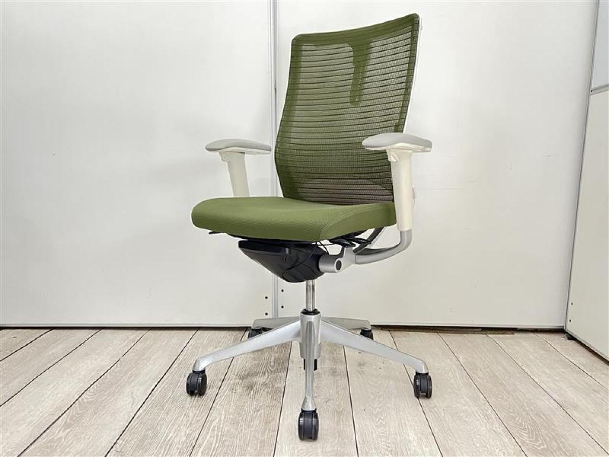 ★【T10】【商品入替のため、残り1脚限り】オカムラ製 コーラル(Choral) ライムグリーン ホワイトシェル ハイバック 肘付き メッシュ背面 アジャストアーム※可動肘 ハンガー付 どんな空間にも調和するデザインと最上級の操作性! 肘付きハイバックチェア!!【管理番号:A01024742】