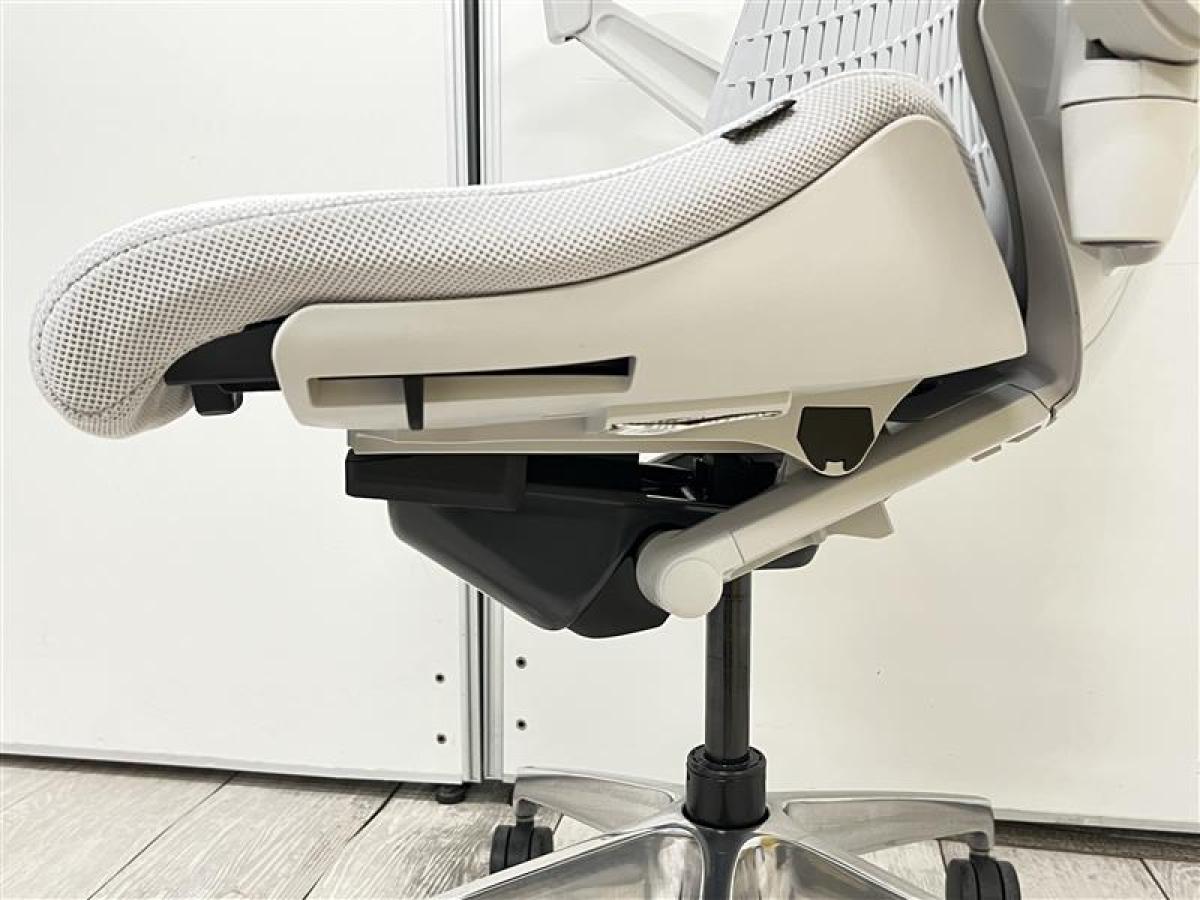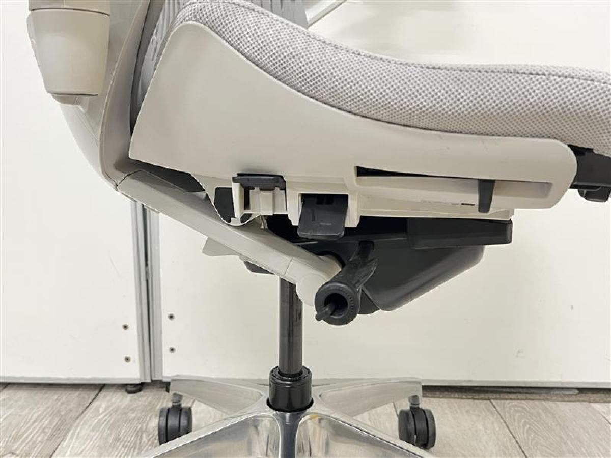 →座面下のレバー操作により、体格に合わせたポジショニング設定が座った状態でできます。座の前縁部が折れ曲がる方式の採用で、ベンディングシートの相性もさらによくなりました。