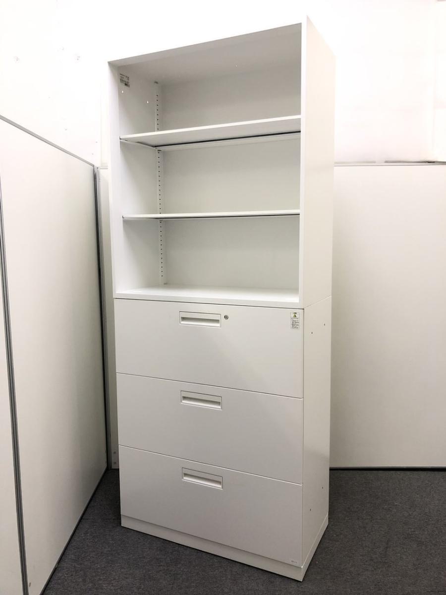【視認性に優れたオープンキャビネット!扉がないので出し入れしやすい!】■コクヨ(KOKUYO)製 ■エディアシリーズ(EDIA) ■オープン書庫×3段ラテラル書庫 ■W900×D450㎜ ■ベース付き ■ホワイト- つくば店