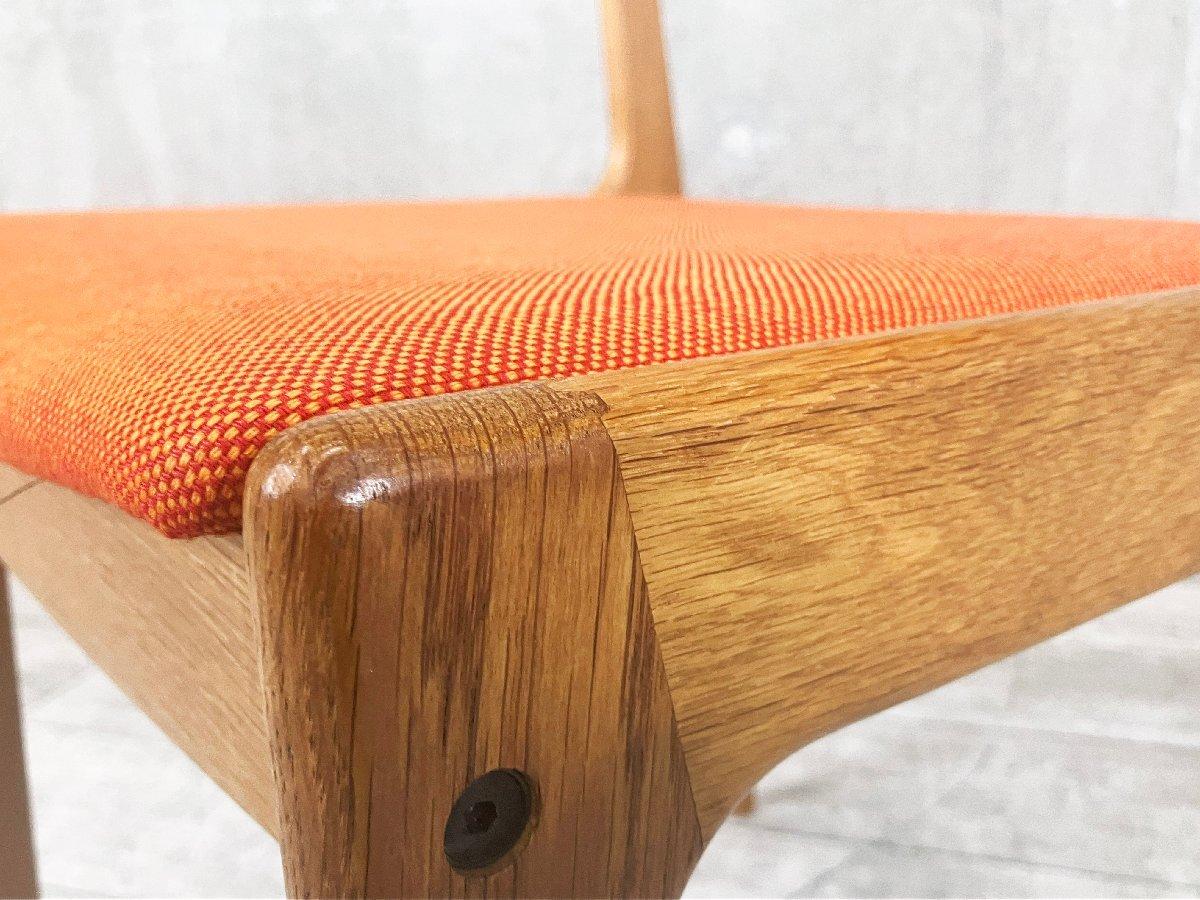 温もりのある無垢材フレームに、北欧らしいオレンジファブリックの座面を組み合わせた一脚。すっきりとしたラインと繊細な脚のシルエットが軽やかな印象を与え、空間に自然と溶け込みます。