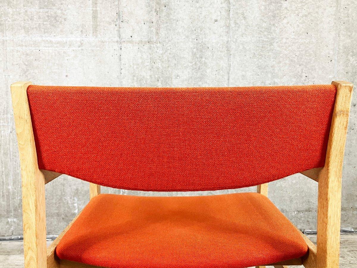 オーク材のフレームに、温かみのあるオレンジファブリックを組み合わせた一脚。直線的な構造美と柔らかな張地のコントラストが魅力で、北欧らしい洗練されたデザインセンスを感じさせます。
