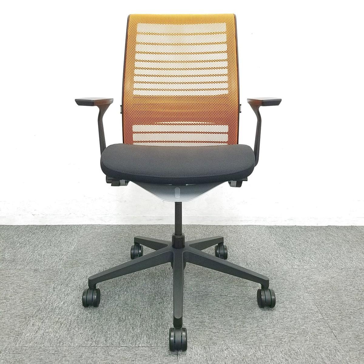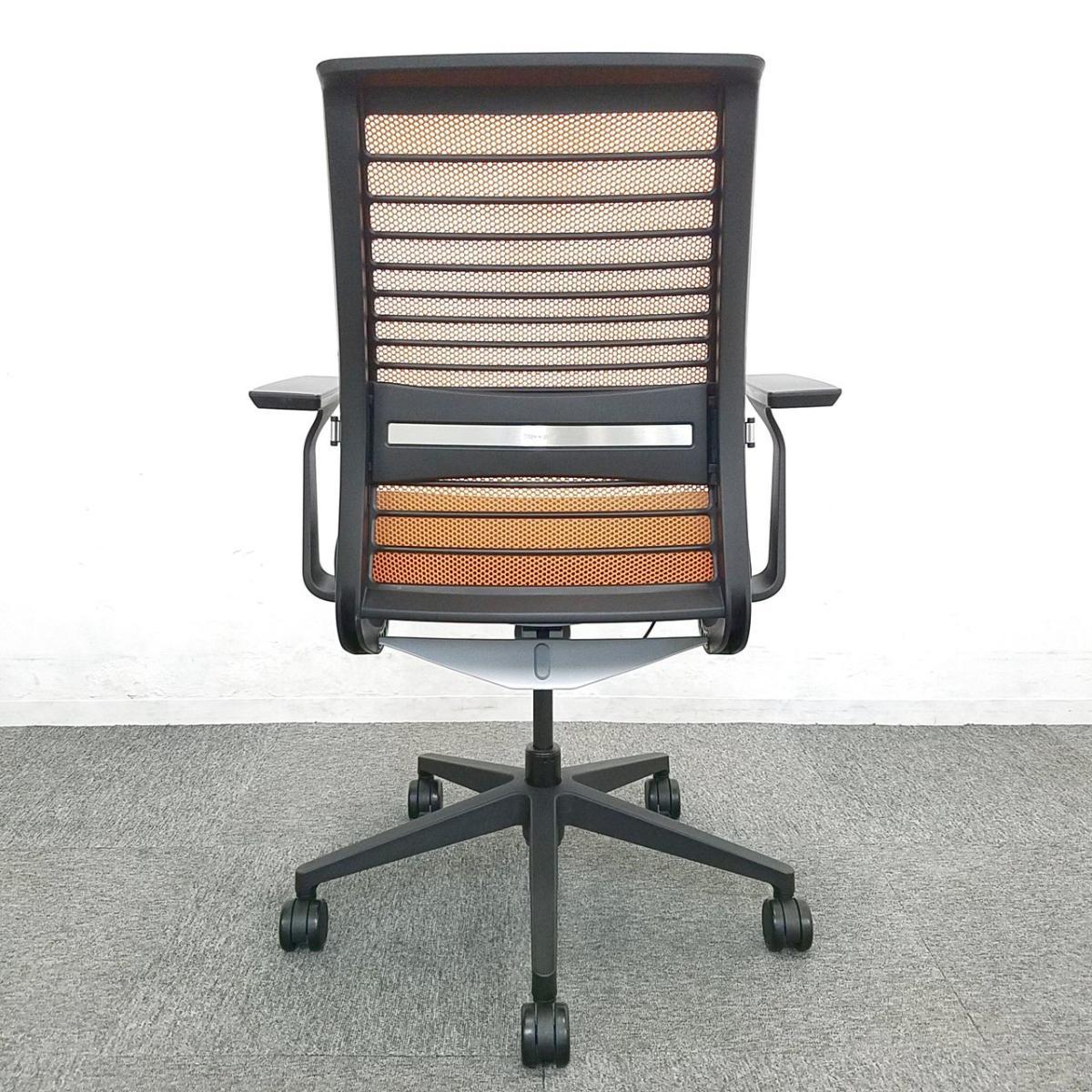 【定価約16万円】【ワイヤーが体にフィットするアメリカ発の大人気商品!長時間の着座ストレスを軽減!】 ■スチールケース(Steelcase)製 シンク(think)チェア 肘付き ハイバック ■メッシュバック ■固定肘/ランバー付 ■背面:オレンジ/座面:ブラック〈岐阜・愛知・三重・静岡・福井〉