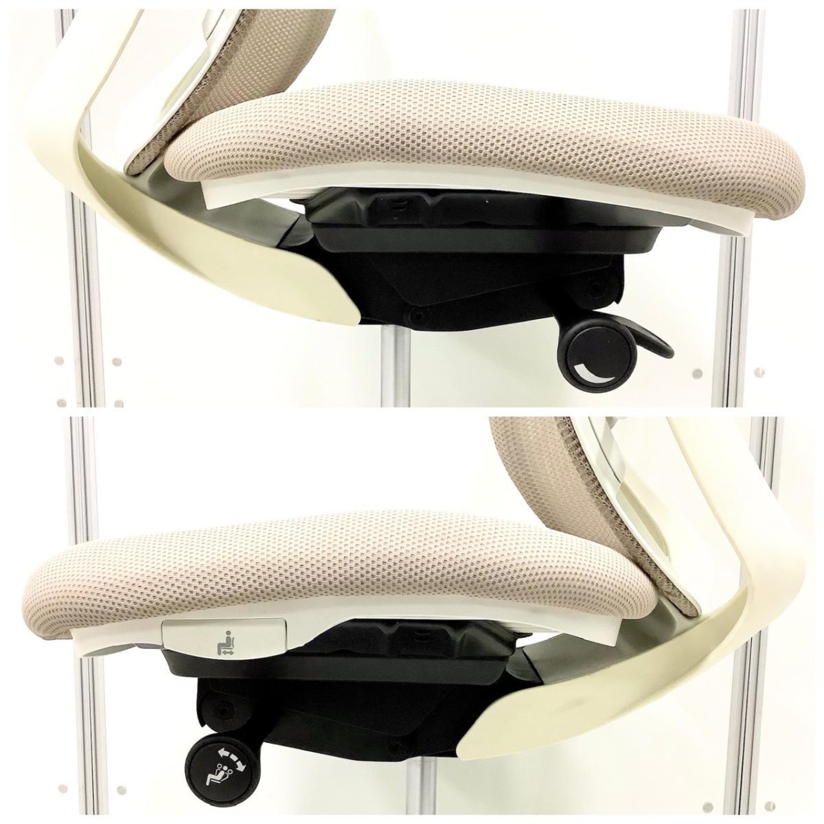 - 座面右下のダイヤル操作で、リクライニングの強弱調整が行えます。これまでのダイヤル式よりも、少ない回転数で、最弱?最強の調整が可能です。