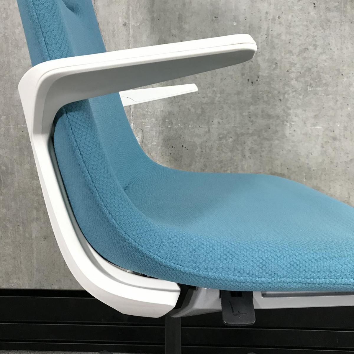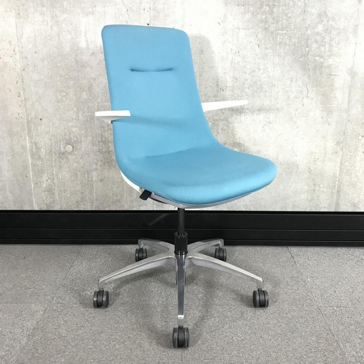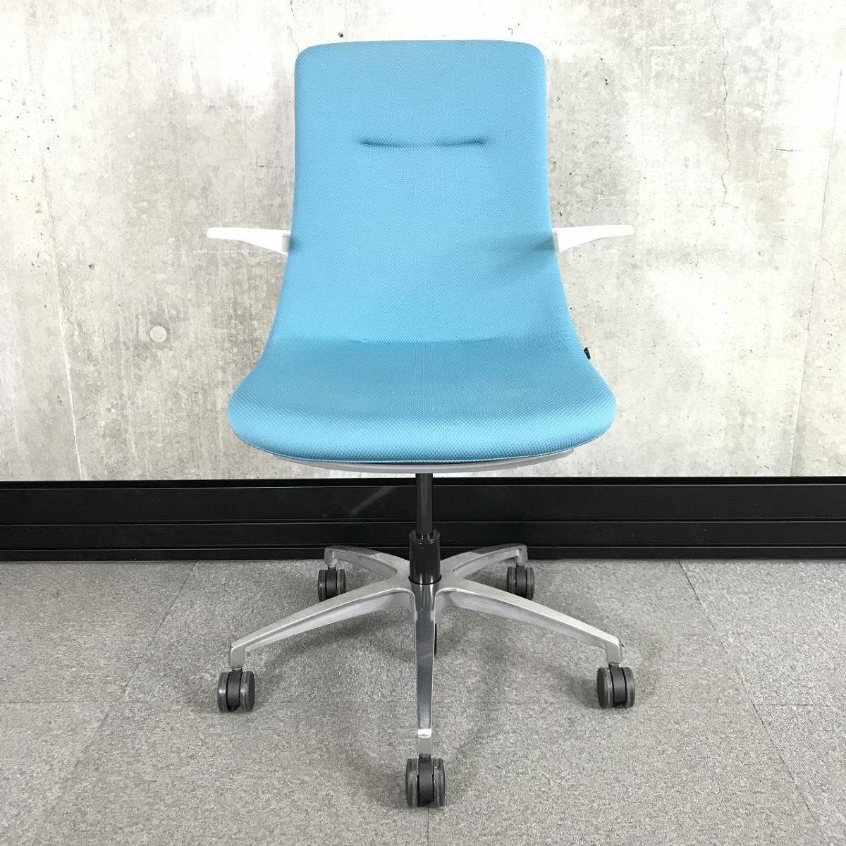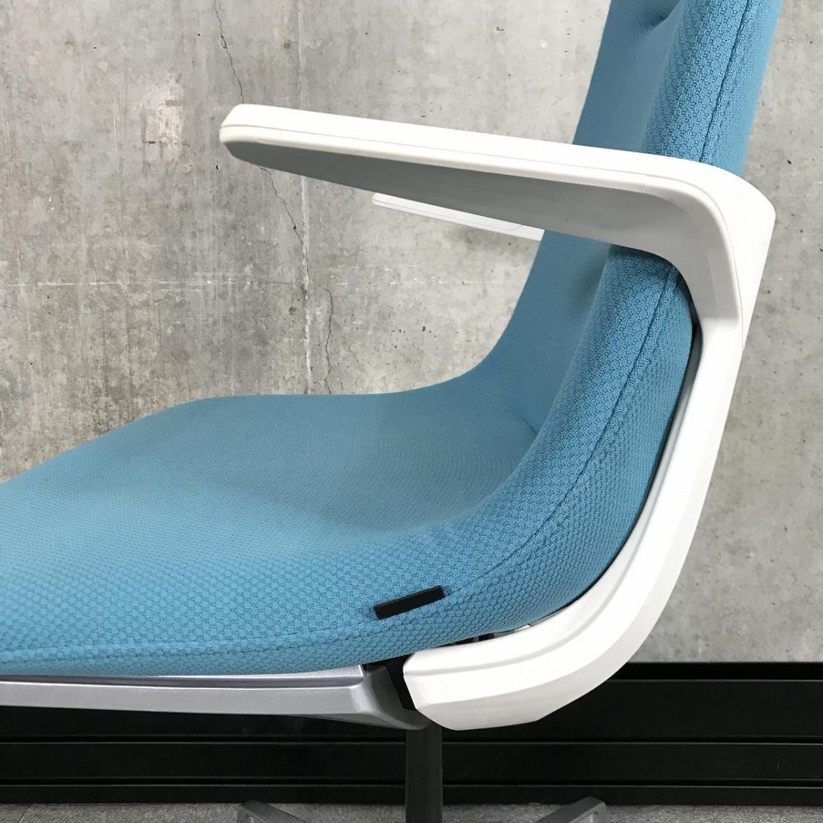 【背と座をなめらかに一体化させた独特のフォルム!】■イトーキ(ITOKI)製 モーブチェア(MOVU) 肘付きミーティングチェア ■固定肘 ■ターコイズブルー シェル色:ホワイト 【2503】弊社使用欄【A01002402】- 埼玉本店