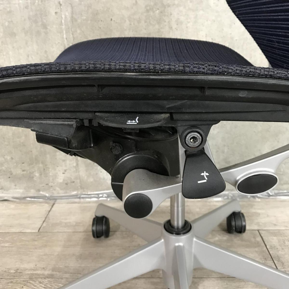 両手を自然に下ろした位置にあるレバーにて、座面の前後スライド調整(前後50mm)が可能です。