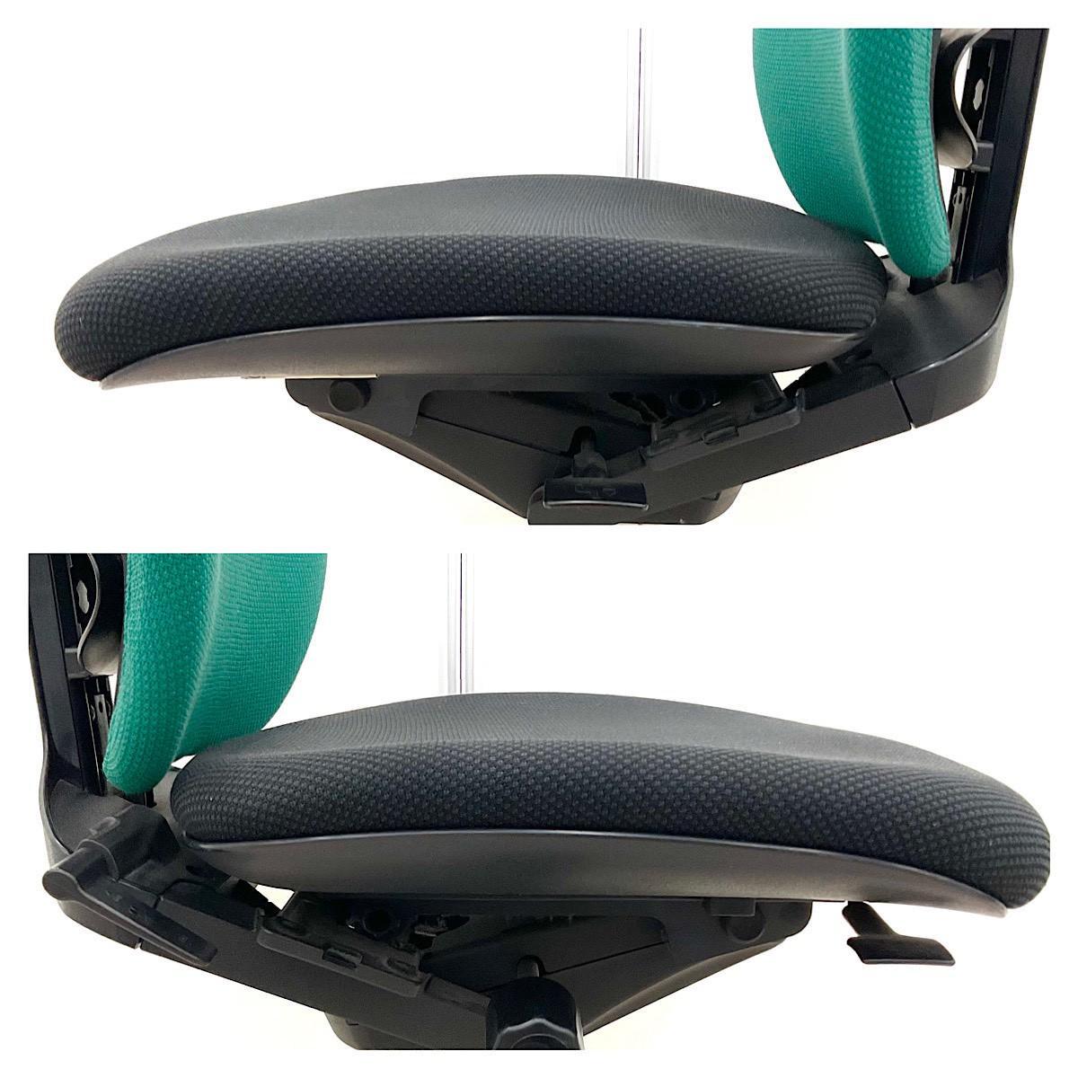 例えば、座面は、イトーキ独自の"ベンディングシート"という機構により、クッション、インターシェル、空洞という三層構造になっています。 この真ん中に挟まっているインナーシェルが、着座時の姿勢に合わせて体重を分散してくれるので、どんな姿勢でも体になじみ、疲労を軽減してくれます。 さらに、座面は前後に4センチほど奥行きを調整でき、前傾姿勢で座りたい、深く腰掛けたい、膝裏を圧迫されたくないなど、個人の好みに合った快適さにカスタマイズが可能となっています。