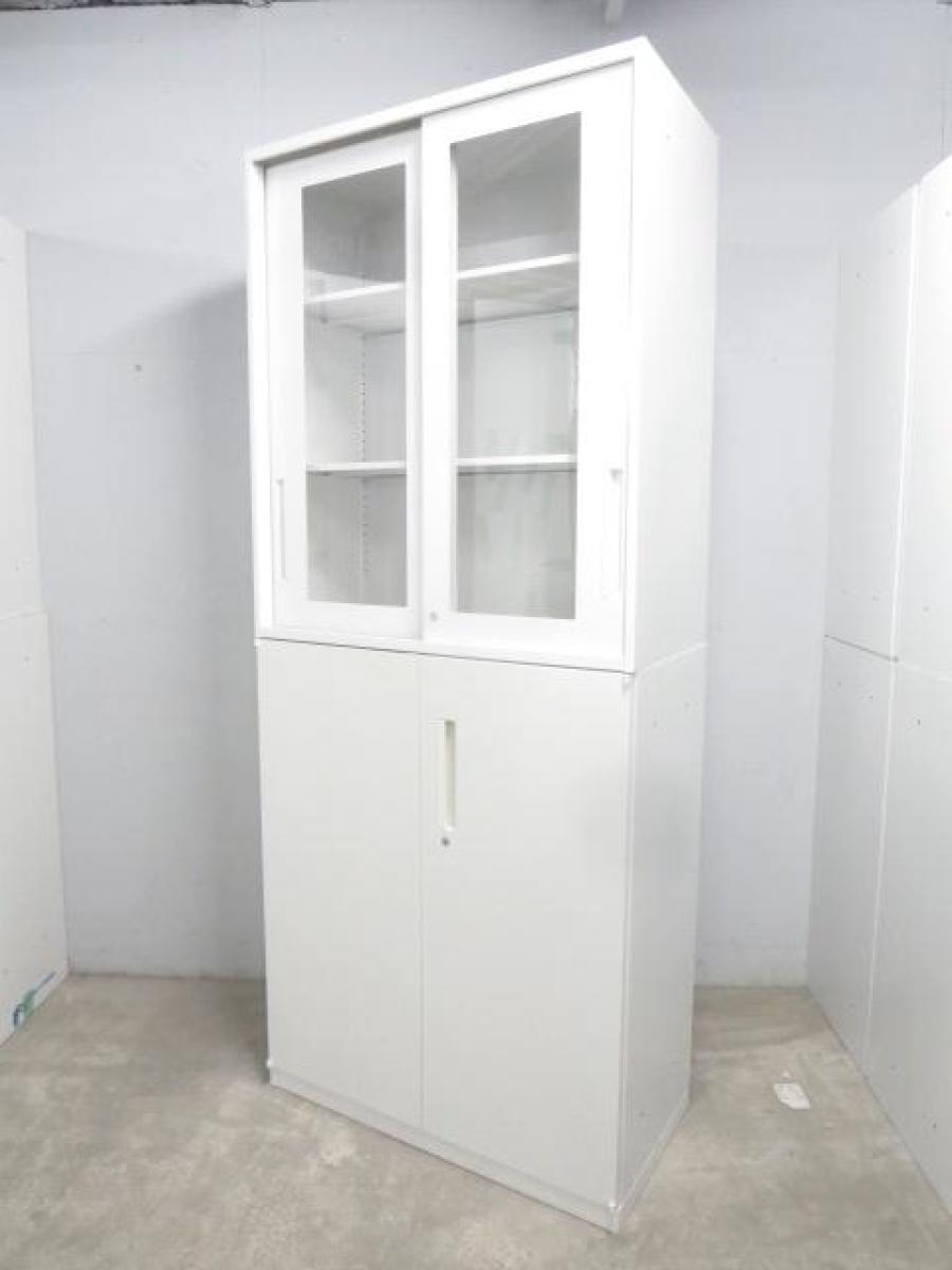 【中身を確認できる!人気のガラス書庫入荷!】■ウチダ(UCHIDA) HSシリーズ 上:ガラス引戸 + 下:両開き書庫セット ホワイト【上下書庫セット】- 川崎店