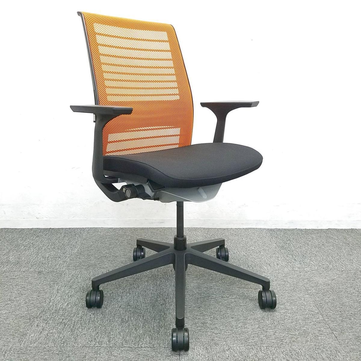 【定価約16万円】【ワイヤーが体にフィットするアメリカ発の大人気商品!長時間の着座ストレスを軽減!】 ■スチールケース(Steelcase)製 シンク(think)チェア 肘付き ハイバック ■メッシュバック ■固定肘/ランバー付 ■背面:オレンジ/座面:ブラック〈岐阜・愛知・三重・静岡・福井〉