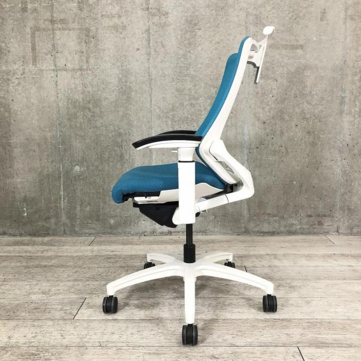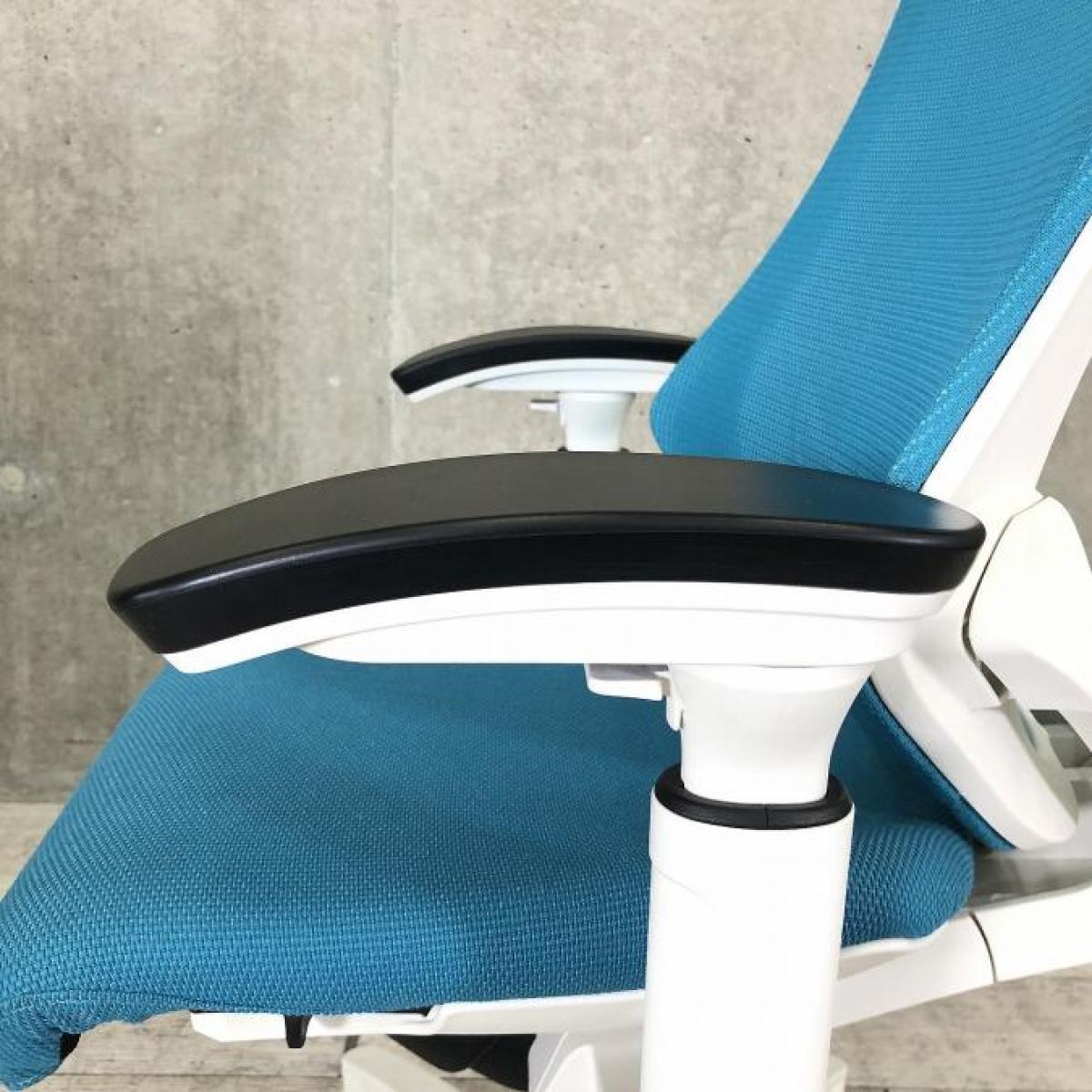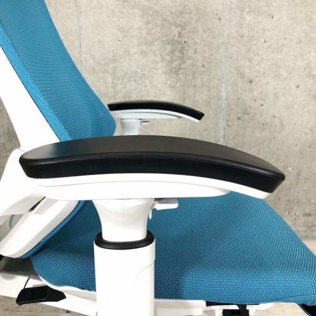 【姿勢の変化にフレキシブルに対応!スタイリッシュで座り心地も抜群な高機能チェア】■イトーキ(ITOKI)製 エフ(f)チェア 肘付き ハイバック 背面メッシュ ■可動肘・ハンガー付 ■ストロングブルー×ホワイトシェル ※日焼け有